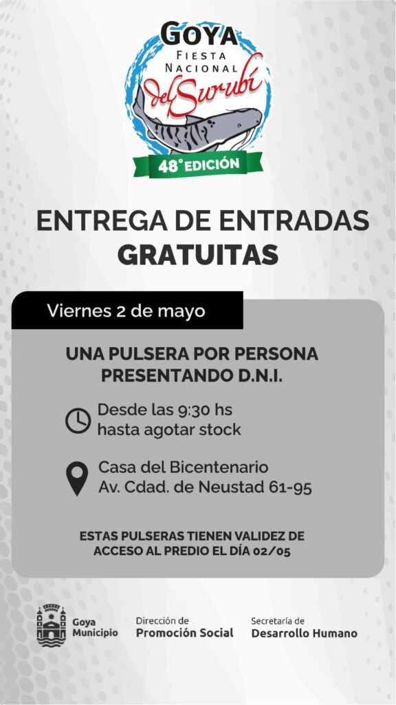 Las entradas correspondientes para el predio Costa Surubí de este viernes 2 de mayo se entregarán a la mañana, desde las 9:30 en Casa del Bicentenario, una por persona con DNI.