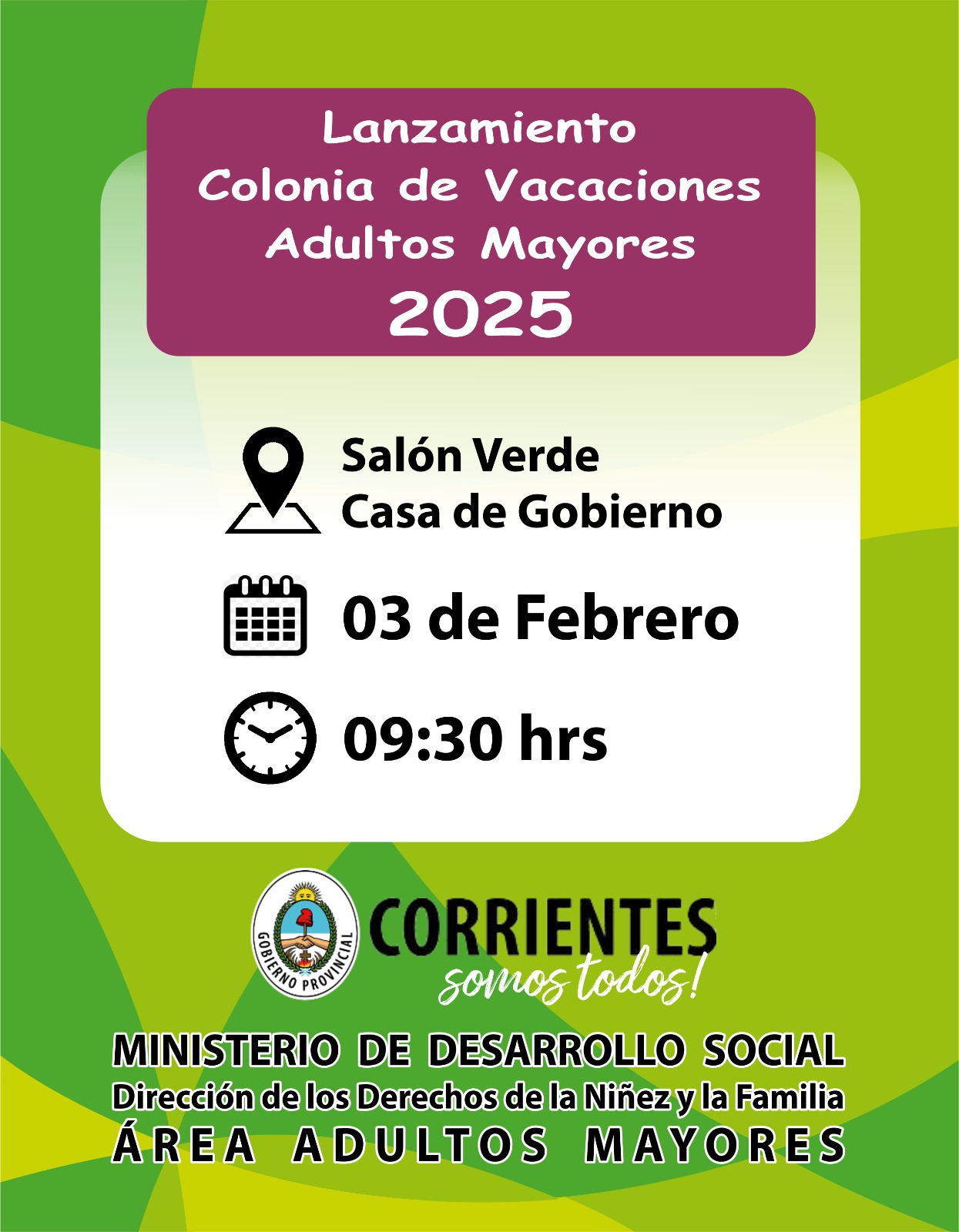 A través del área de Adultos, de la Dirección de los Derechos de la Niñez y la Familia, se realizará este lunes el lanzamiento de la Colonia de Vacaciones de Adultos Mayores 2025, en el Salón Verde de Casa de Gobierno. El mismo tendrá lugar a las 9.30.