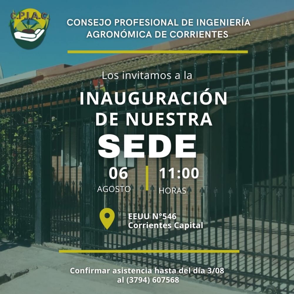 Este martes 6, el Consejo Profesional de Ingeniería Agronómica de Corrientes (CPIAC) inaugurará su sede, la cual está ubicada en Estados Unidos 546 del barrio Pompeya de la Capital. El evento será a las 11.