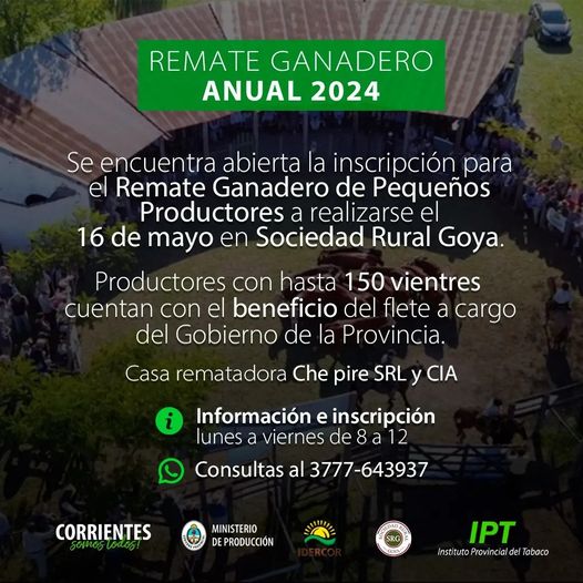 Más adelante indicó: “Este remate está destinado a los productores de Goya, Carolina, San Isidro, en definitiva, el departamento de Goya, pueden participar con las condiciones enumeradas. Este remate tiene una gran afluencia de público, de productores, nos gratifica, es un evento social donde podemos compartir, funcionarios y sector productivo, la experiencia, como lo ocurrido en los remates anteriores”. Para finalizar Vicente Pico detalló dónde pueden acudir los destinatarios para su participación: “Los productores pueden recabar mayor información e inscribirse para participar del remate del próximo jueves 16 de mayo, en el IPT, con la firma consignataria Che Pire de “Pancho” Gortari y la Sociedad Rural de Goya, con estos contactos se puede canalizar la presencia en este encuentro”.