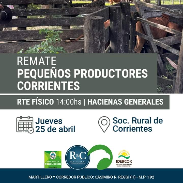 El Ministerio de Producción de la Provincia, a través del Instituto de Desarrollo Rural de Corrientes (IDERCOR), prepara un nuevo Remate de Pequeños Productores pero esta vez en el Departamento Capital. Tendrá lugar el jueves 25 de abril a partir de las 14 horas, en el predio ferial de la Sociedad Rura de Corrientes (SCR), ubicada sobre la Ruta Nacional N°12 en Riachuelo.