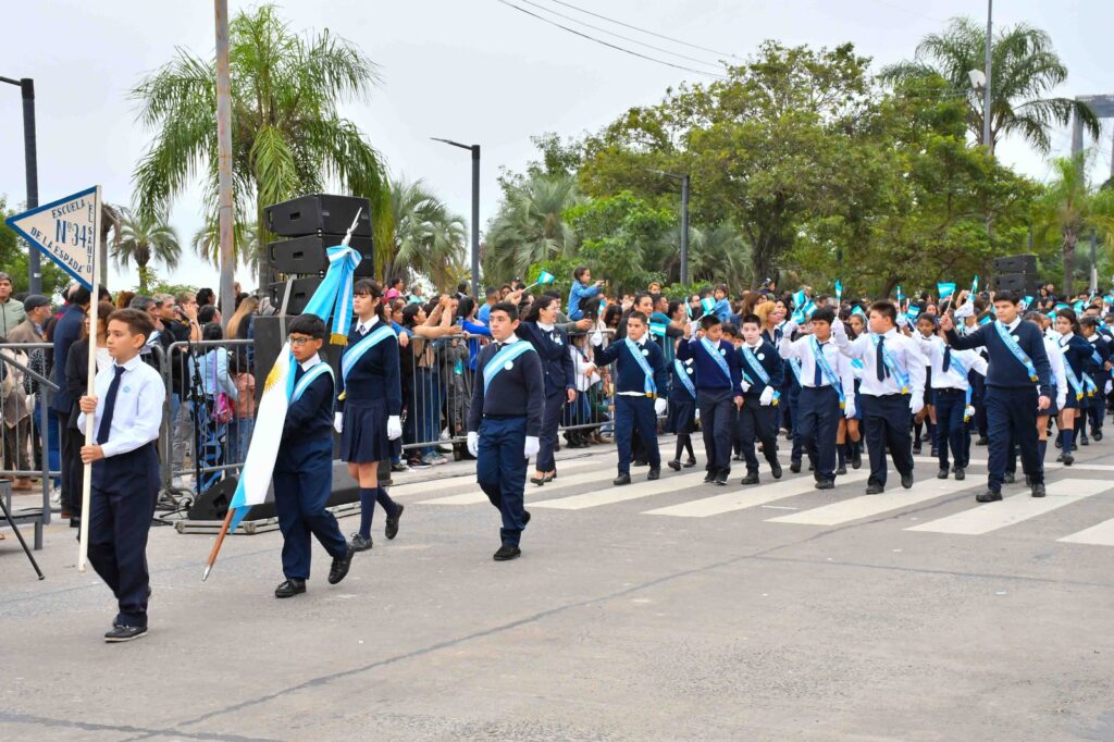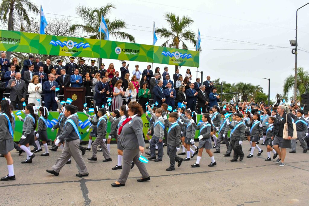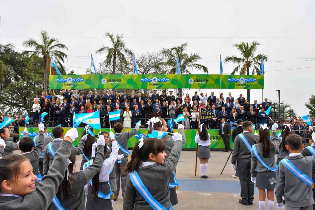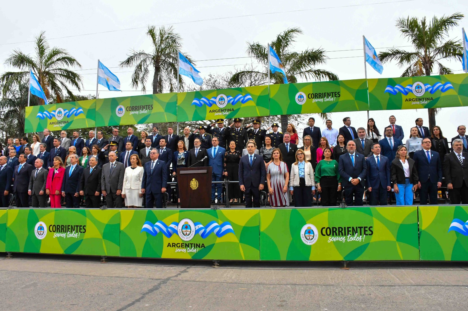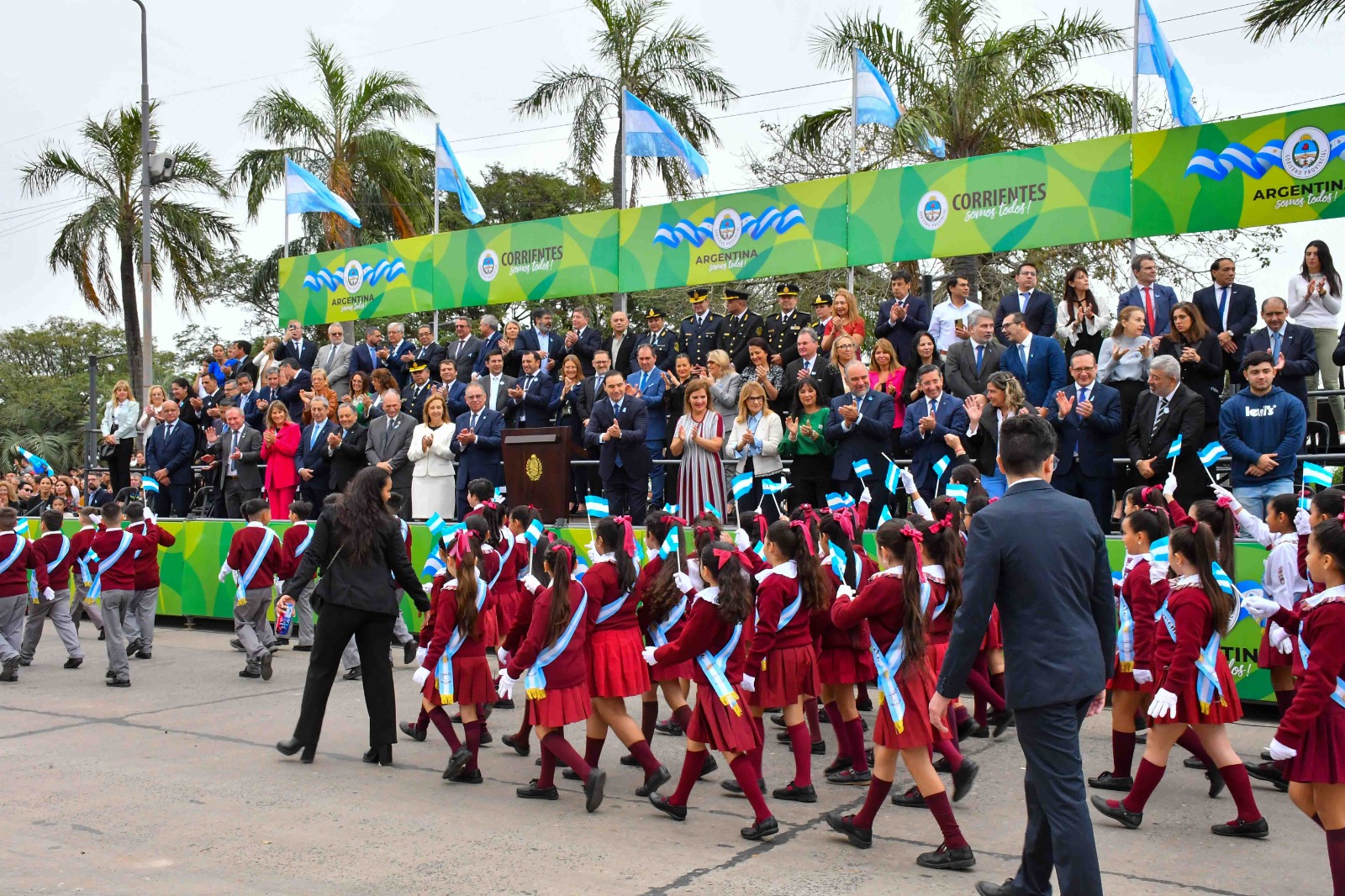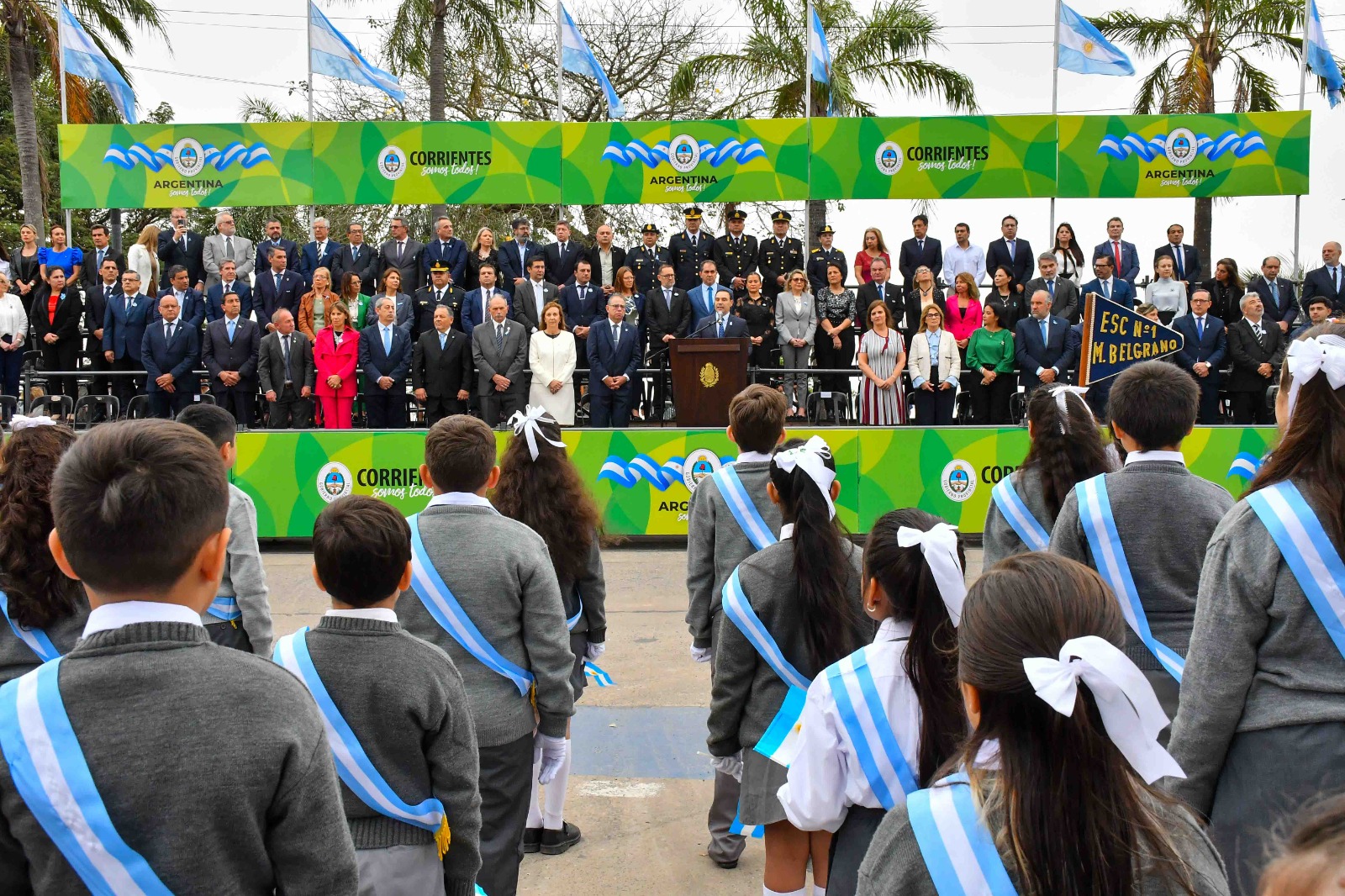 Como parte del acto, se entonaron las estrofas del Himno Nacional Argentino, ejecutado instrumentalmente por la Banda de la Policía de Corrientes.Para concluir, tuvo lugar el Desfile Escolar en Costanera Juan Pablo II, seguido de cerca por una multitud en una jornada teñida por los colores celeste y blanco.