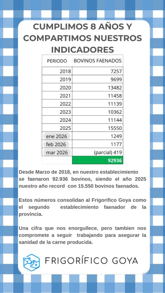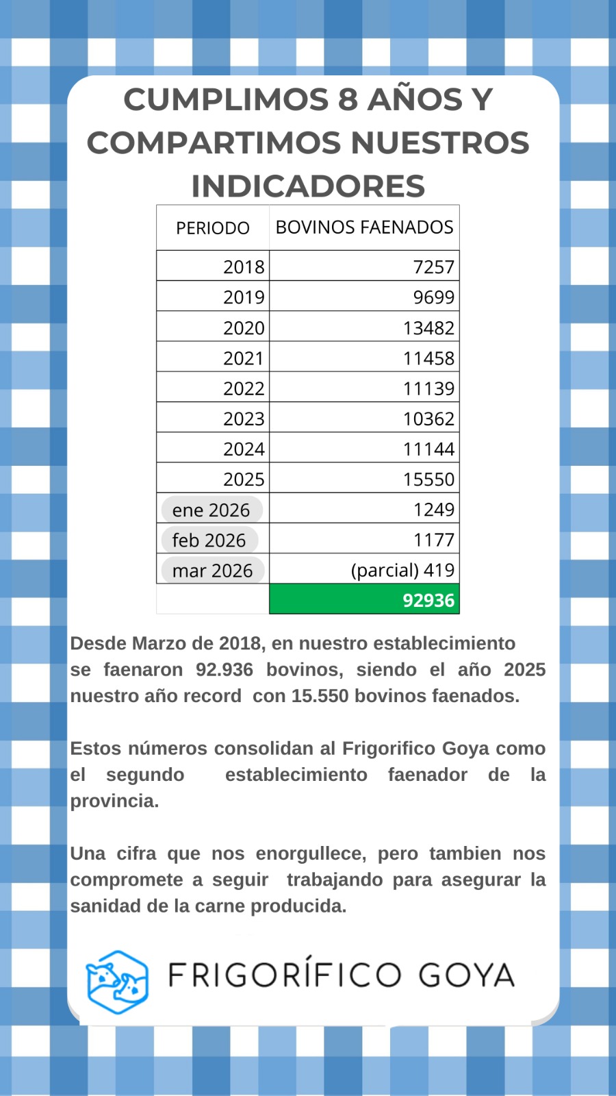 Desde su instalación, hace 8 años, la capacidad operativa refleja el crecimiento de producción en más de un 100% en faenas, en el 2018 se faenaron 7257, en 2025 se realizaron 15550 faenas. Estas estadísticas demuestran el desarrollo, en menos de 8 años, de la Planta Faenadora del Frigorífico Goya.