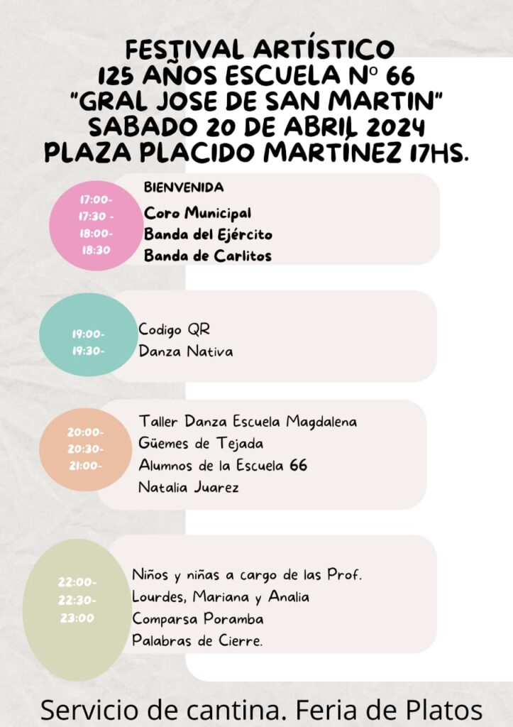 La profesora de la mencionada escuela anunció: “La primera actividad será este sábado, un festival desde las 17 horas en plaza Plácido Martínez, con la actuación del Coro Polifónico Municipal, la Banda Puerto Argentino, la Banda de Carlitos, Danzas Nativas, Banda QR, el taller de Danza de la Escuela Magdalena Güemes de Tejada, la comparsa Poramba y el taller de nuestra escuela”.