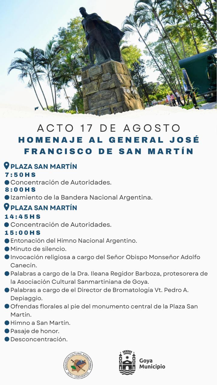 El próximo domingo 17 de agosto, a las 15 horas, la Asociación Cultural Sanmartiniana y la Municipalidad de Goya invitan al acto conmemorativo del paso a la inmortalidad del “Padre de la Patria”, general José Francisco de San Martín, a realizarse en la plaza que perpetúa la memoria del “Gran Capitán”.