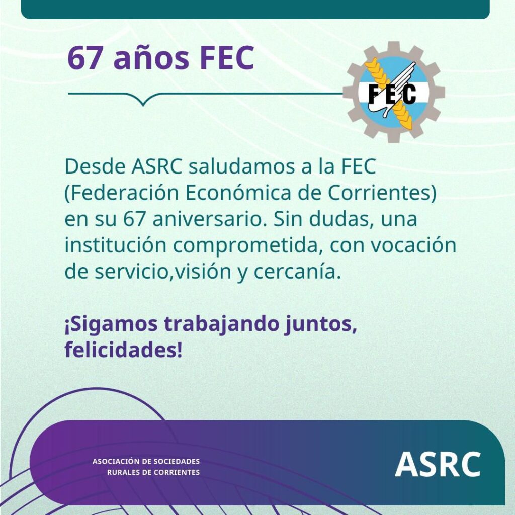 Desde la Asociación de Sociedades Rurales de Corrientes, hacen llegar el reconocimiento y saludos por la labor desplegada durante estos 67 años de conformación.