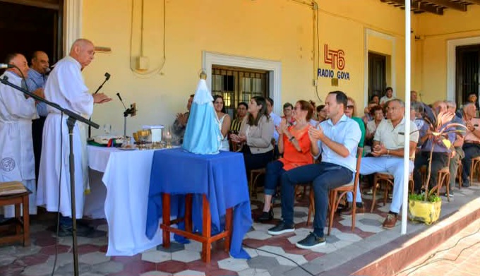 Este viernes 31 de enero, la histórica Radio LT6 de Goya conmemoró sus 72 años de trayectoria con una emotiva misa de acción de gracias, celebrada en el patio de la emisora. La ceremonia, oficiada por el padre Cattay, reunió a diversas autoridades municipales, militares y policiales, así como a comunicadores y oyentes que forman parte de la extensa familia de la radio.
