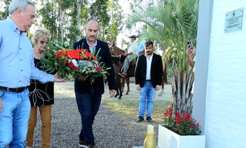 El Intendente Mariano Hormaechea junto al Secretario de Gobierno de Yatay Ti Calle Jorge Sandoval y la Directora de Cultura del Municipio de Carolina Milagros Guzmán depositaron la ofrenda floral al pie del Monolito.