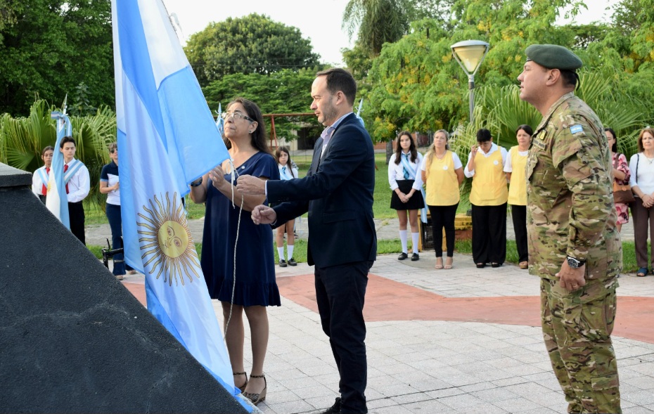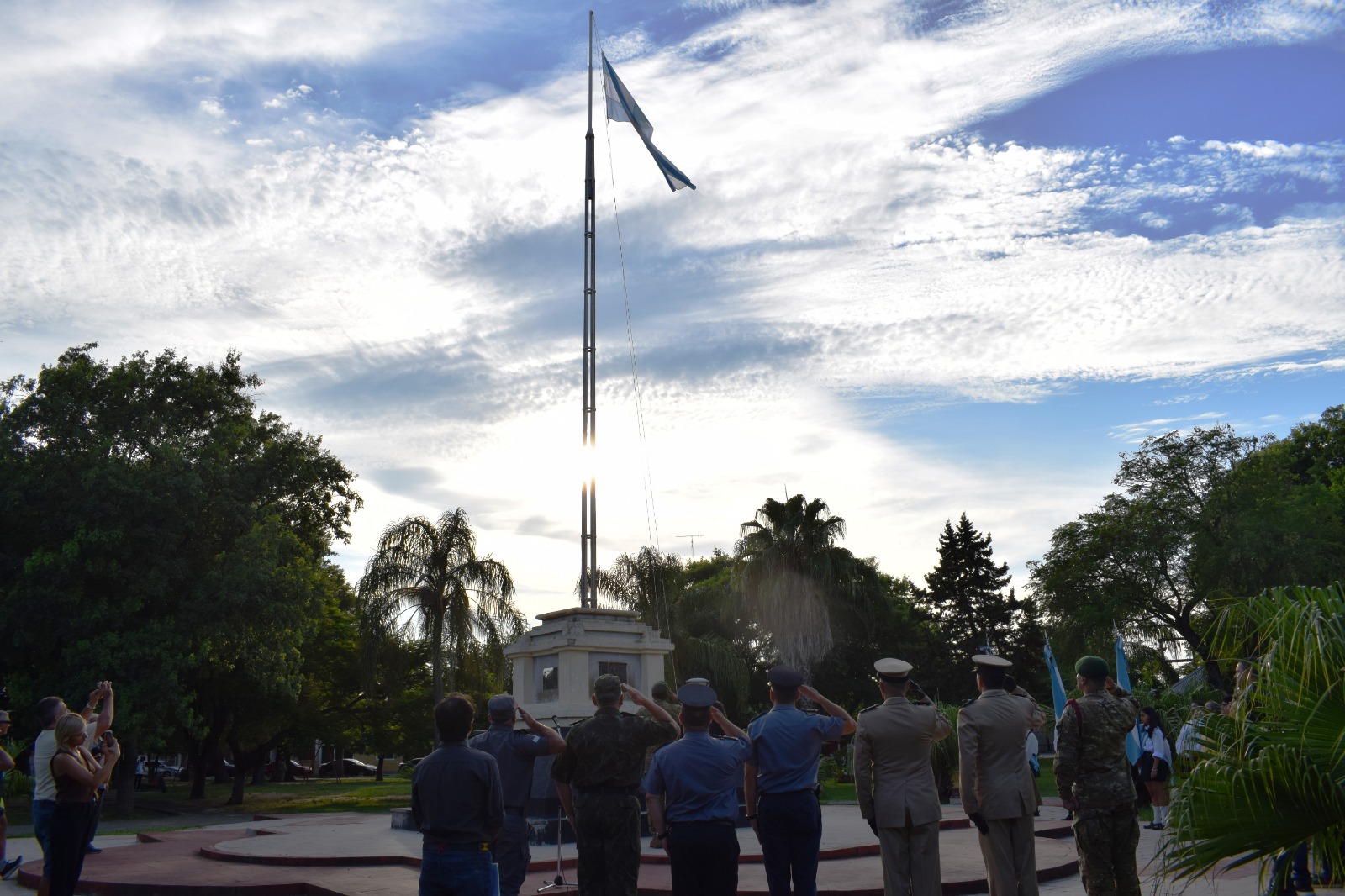 El solemne acto dio inicio en la plaza Plácido Martínez, donde se realizó el izamiento de la bandera a cargo del Dr. Mariano Hormaechea, el Teniente Coronel Sergio Ortiz y la profesora Marisa Báez. Durante la ceremonia, el Sargento Trompeta Daniel González, del Batallón de Ingenieros Monte 12, acompañó el izamiento con el toque ceremonial de trompeta y luego se entonaron las estrofas del Himno Nacional Argentino.