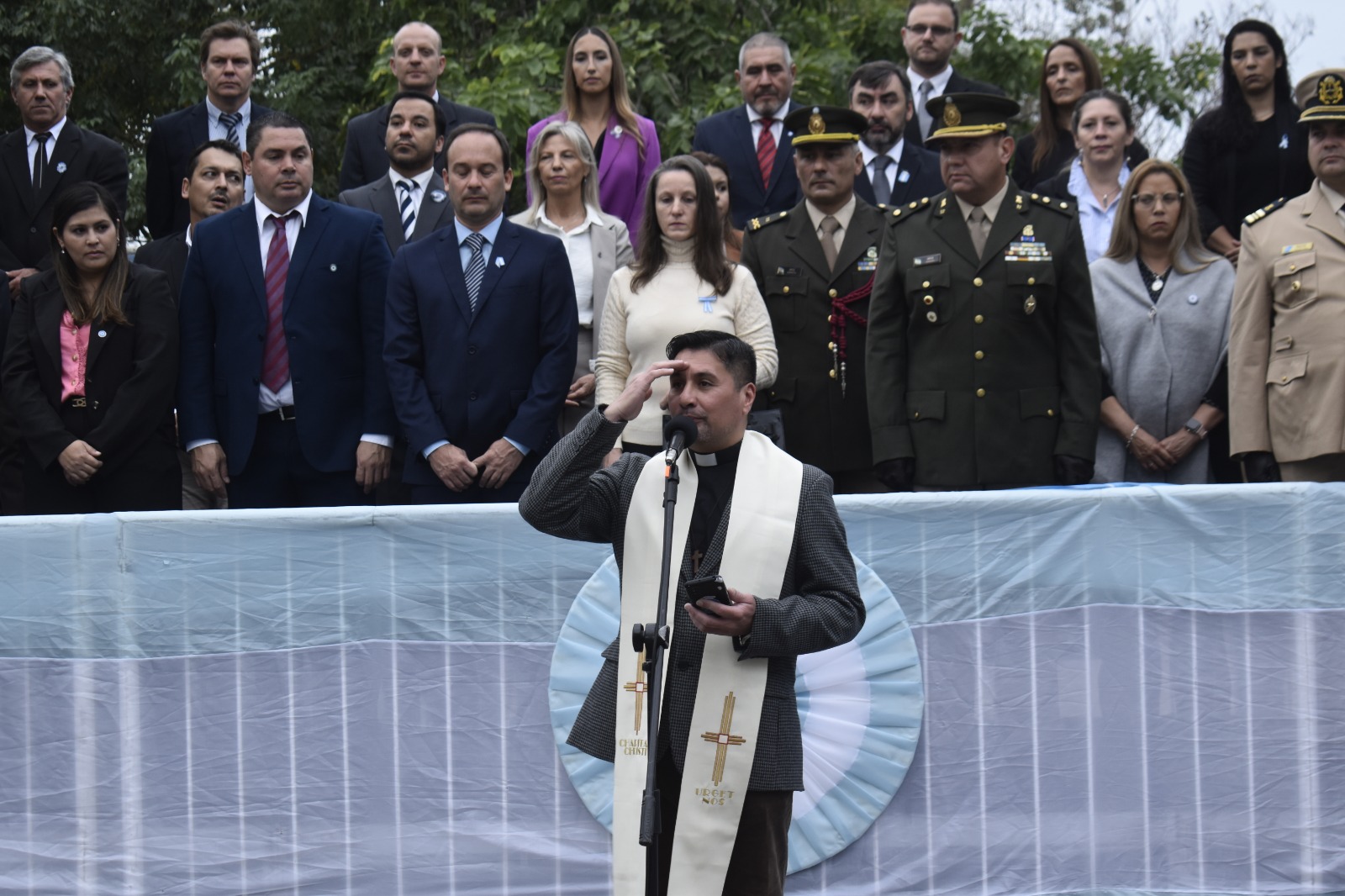 Este (cada) 20 de junio, nos reunimos para suplicar una bendición que nos haga encaminar con esperanza hacia un futuro de prosperidad y de permanente paz social; y para dar gracias por este gran país que tenemos, con su historia tejida de coincidencias y desencuentros, invocación religiosa a cargo del Cura Párroco de la Iglesia Catedral, Nuestra Señora del Rosario”, Padre Ariel Giménez, quien en su reflexión animo a los presentes a que “Nadie nos robe el futuro” basándose para su ilustración en un texto del Antiguo Testamento que hacia mencion a la figura de Moises y el símbolo de identidad, para ayudar a pensar: “en la figura de Belgrano, que dejo este legado la bandera como el mejor símbolo de unidad entre todos los argentinos, hoy es un dia para recordar, para reafirmar un compromiso, con el respeto, la generosidad y la memoria, el respeto de quien puso los ideales de libertad e igualdad desde la educación para todos, generosidad para entregar cuanto tenia para la construcción de la nación con el sello de indentidad de memoria para recordar cada gesto, cada valor signos tan vigentes en nuestros, días, a uds (a los estudiantes) a afirmar este compromiso con los valores de Belgrano desde sus ganas cada dia para estudiar y ser mejores,ser competentes y con la memoria también nosotros los adultos no permitamos que nos roben el futuro, ese que nos (les) pertenece, en esa memoria hoy no olvidemos que queremos tener a Loan (menor desaparecido) entre nosotros, los invito a rezar juntos el padrenuestro.”