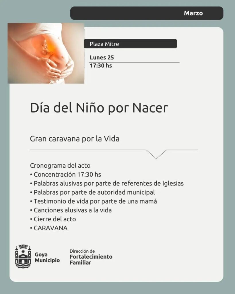 Desde la Municipalidad de Goya, a través de la Dirección de Fortalecimiento Familiar, adhieren a esta fecha, reafirmando el compromiso en favor de la vida del Niño por Nacer y de la madre que lo lleva en su vientre.