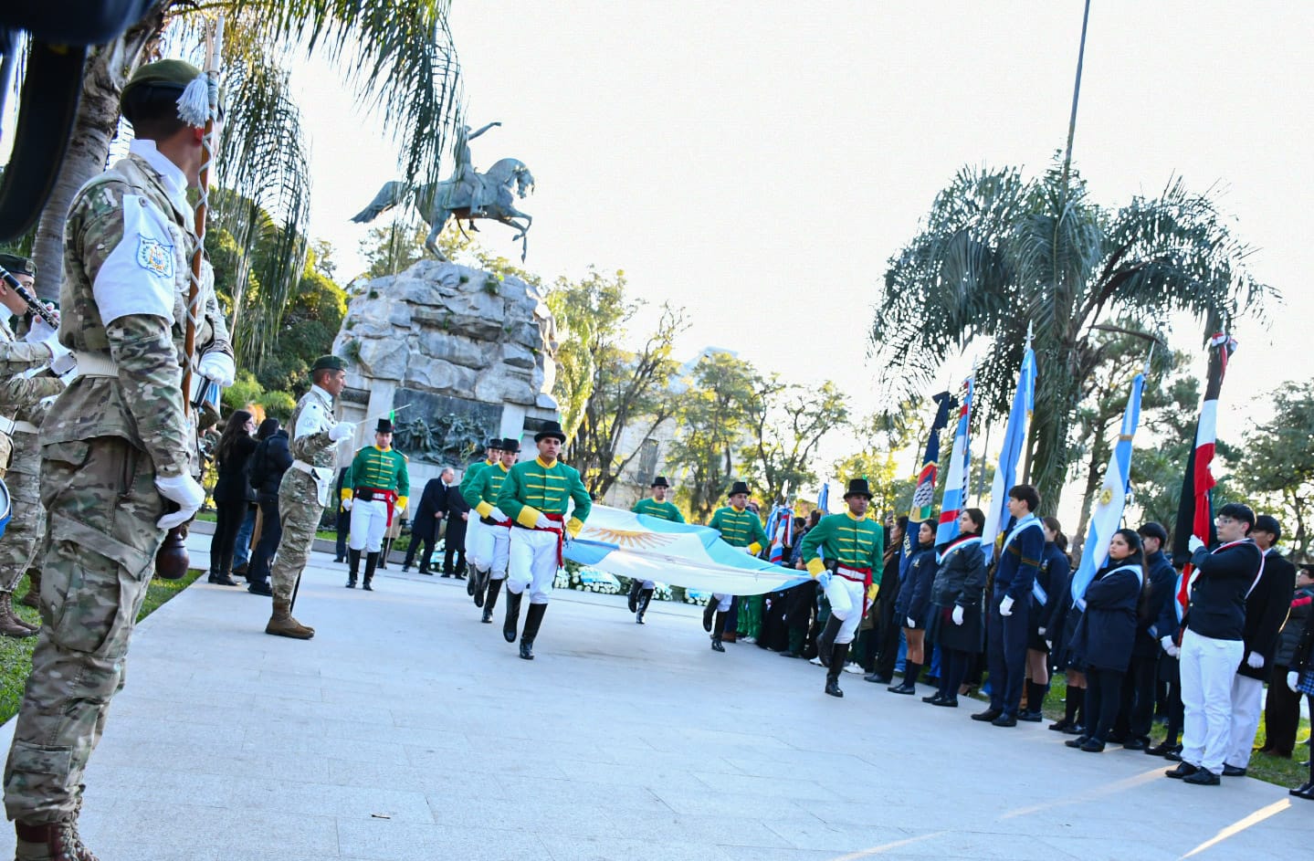 Como es tradicional, la actividad arrancó en la Plaza 25 de Mayo, en donde como indica el protocolo, se llevó a cabo el izamiento del Pabellón Nacional, se colocaron ofrendas florales al pie del monumento al General San Martín, seguido de un minuto de silencio.