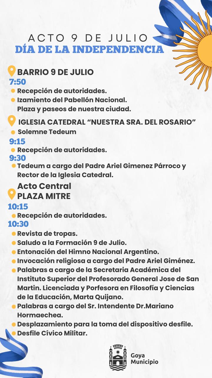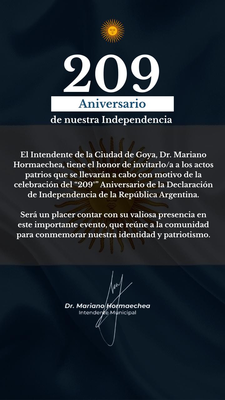 La Municipalidad de Goya invita a los actos patrios que se llevarán a cabo con motivo de la celebración del “209” aniversario de la Declaración de Independencia de la República Argentina.