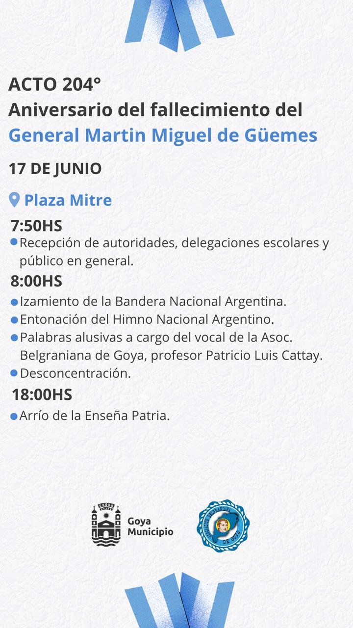 La Municipalidad de Goya y la Asociación Civil Belgraniana invitan al acto recordatorio del fallecimiento del caudillo salteño Martín Miguel de Güemes.