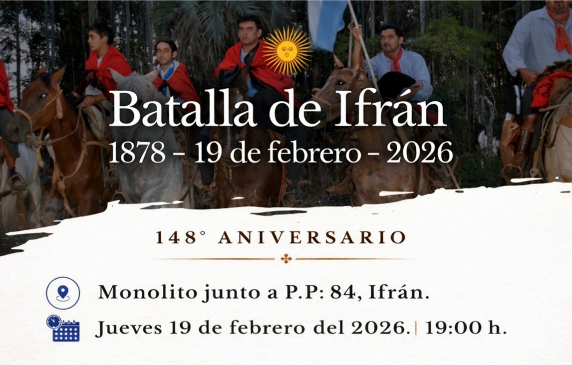 El acto recordatorio del 148º aniversario de la Batalla de Ifrán se realizará este jueves, 19 de febrero, a partir de las 19 horas y junto al monolito ubicado en la Ruta Provincial 84.