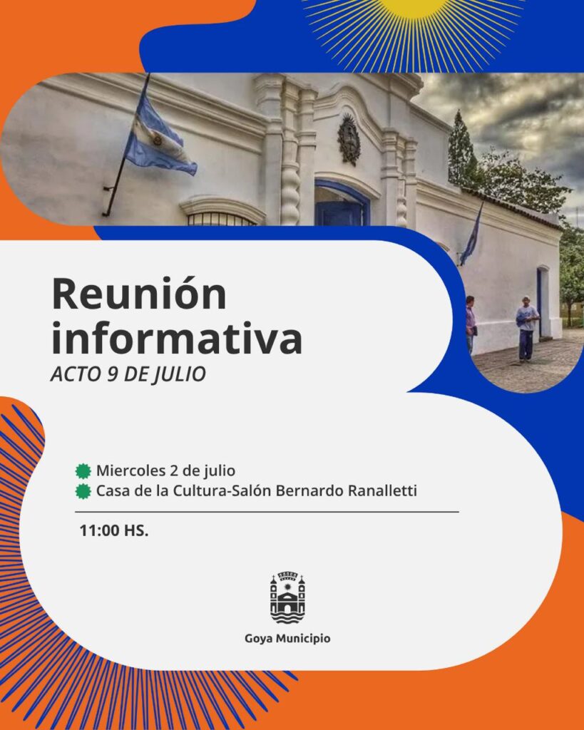 La Municipalidad de Goya invita a representantes de establecimientos educativos, clubes, institutos, agrupaciones Fuerzas de seguridad a participar de la reunión para desarrollar programas de actos y desfile cívico – militar del 9 de julio.