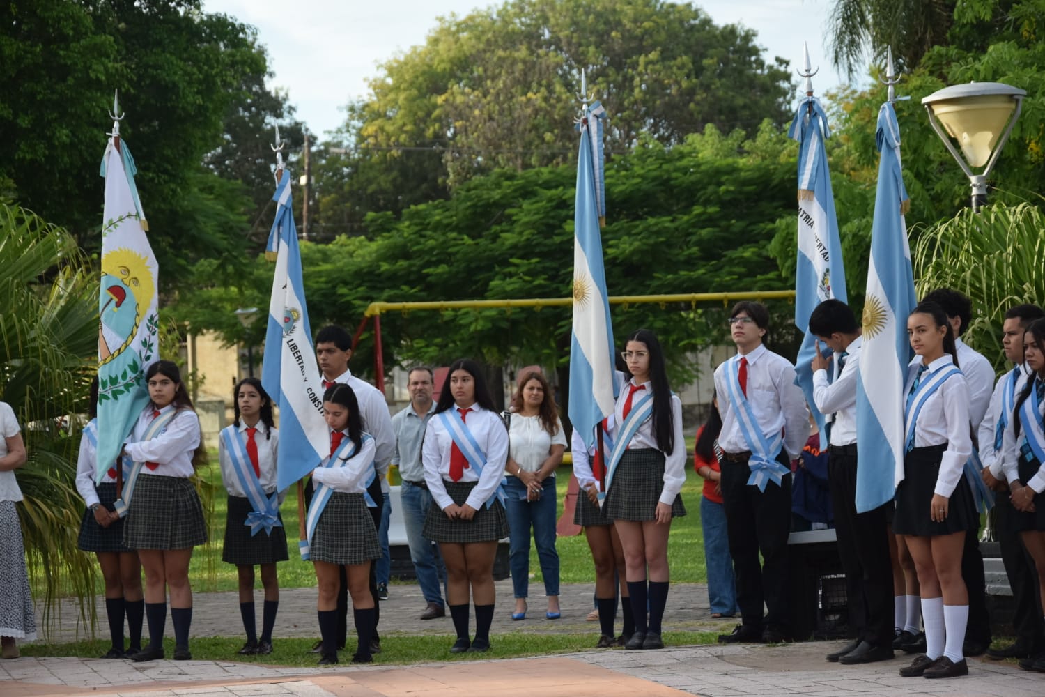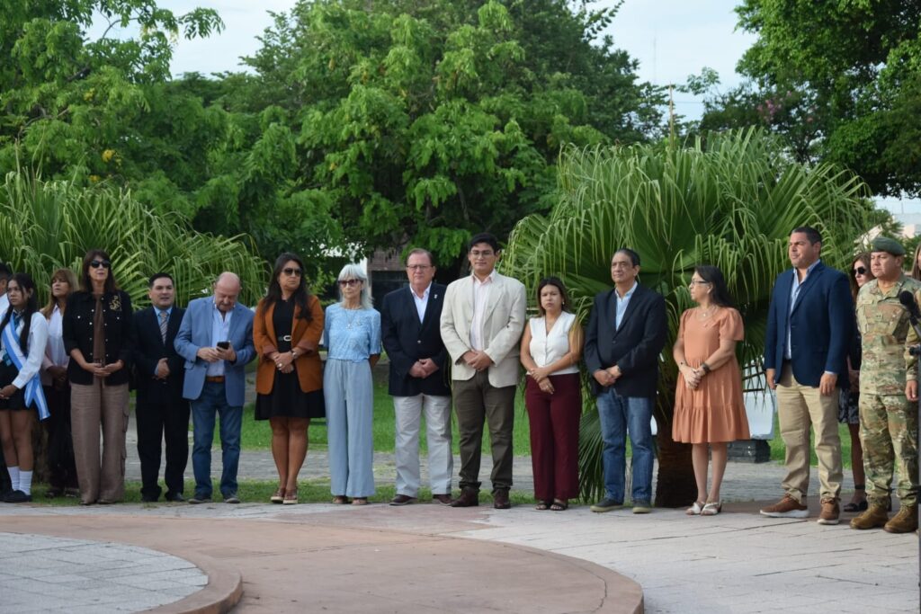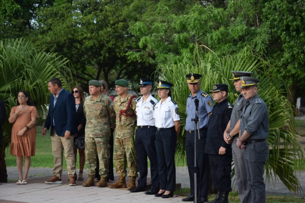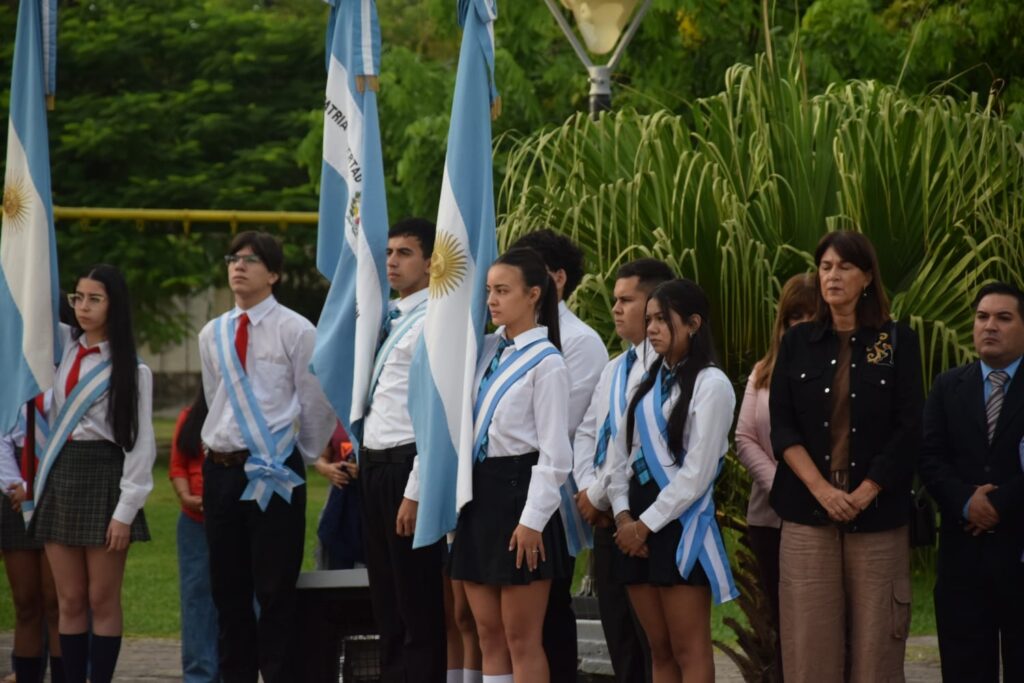 El solemne acto se inició con el izamiento del pabellón nacional, a cargo del secretario de Gobierno Fernández, el teniente coronel Ortiz y la profesora Báez. El momento estuvo acompañado por el toque ceremonial del sargento trompeta Daniel González, del Batallón de Ingenieros de Monte 12, tras lo cual se entonaron las estrofas del Himno Nacional Argentino.