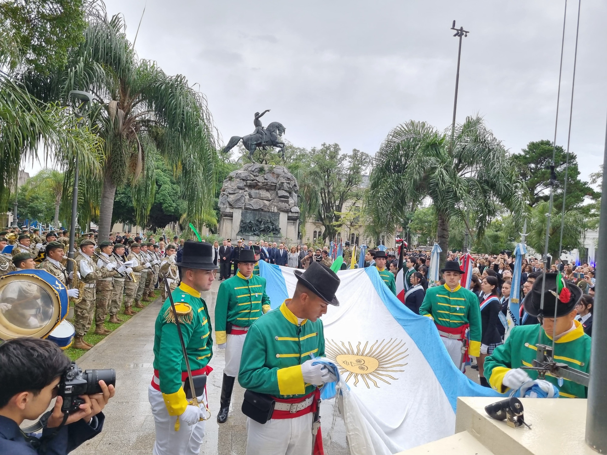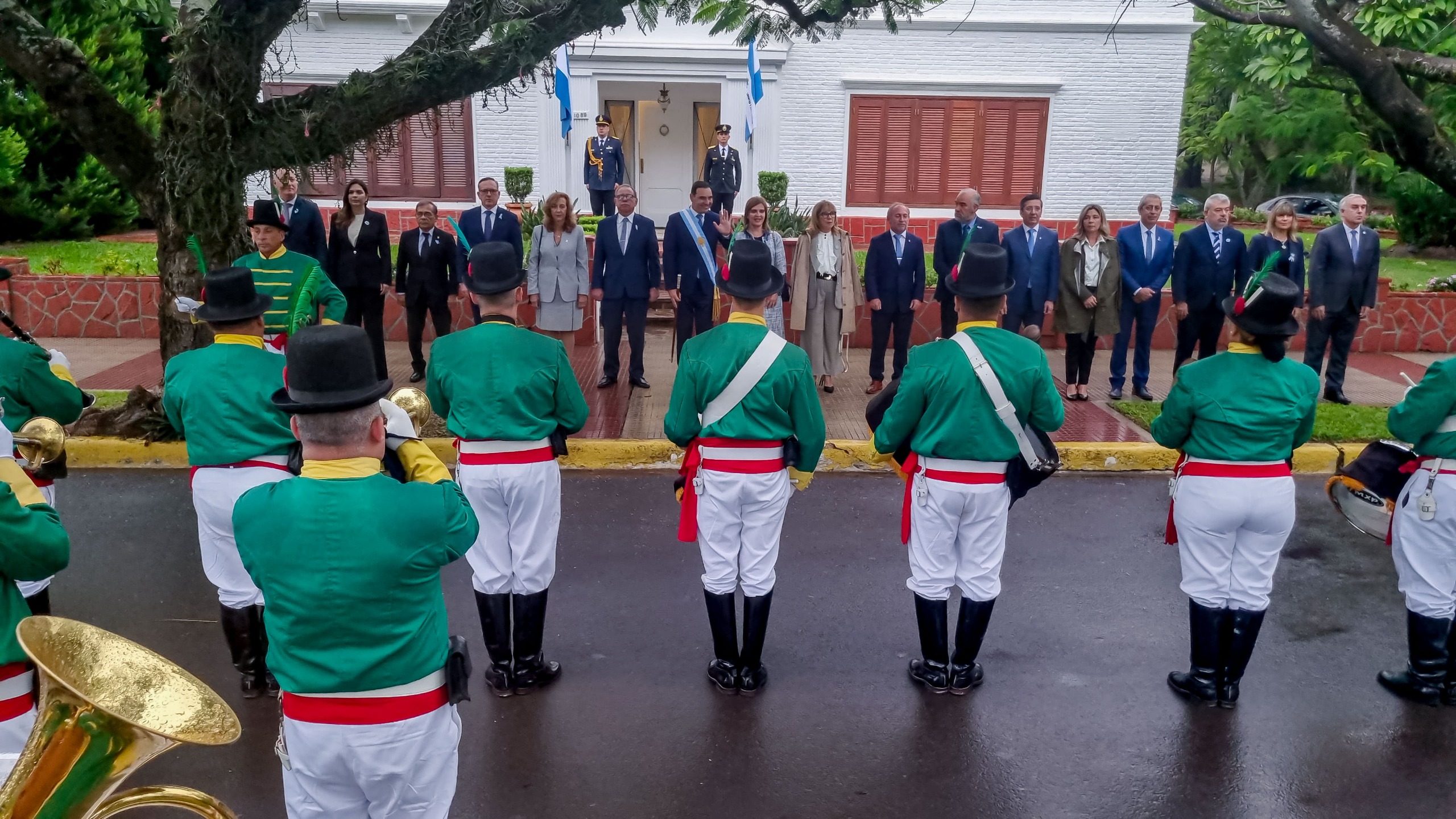 Al iniciar la celebración por el 215° aniversario de la Revolución de Mayo el gobernador Gustavo Valdés, junto a su señora esposa Cristina Garro, el intendente Eduardo Tassano y miembros del Gabinete provincial, recibió a las 8.00 frente a su Residencia oficial a la Banda de la Policía de Corrientes el uniforme de Cazadores Correntinos para escuchar la ejecución de la Diana de Gloria y para finalizar la Marcha de San Lorenzo, ejecutada por la Banda.