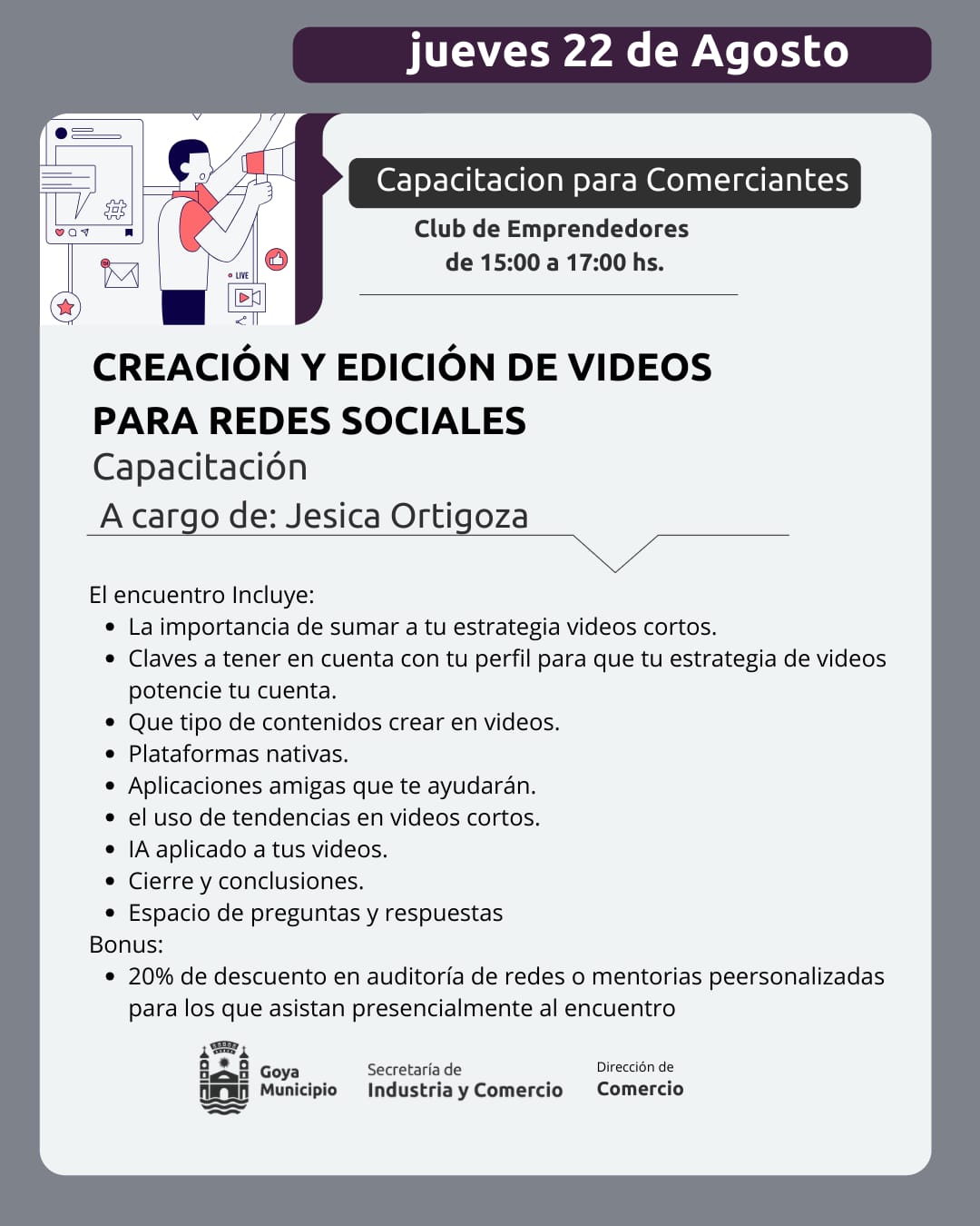 En el marco del programa “Goya Líquida”, la Municipalidad de Goya, a través de la Secretaría de Industria y Comercio y Dirección de Comercio, invita a los comerciantes a participar de una capacitación que se llevará a cabo hoy, jueves 22 de agosto. Esta jornada formativa, orientada a potenciar el uso de videos en redes sociales, se desarrollará en el Club de Emprendedores, de 15 a 17 horas, y estará dirigida por la experta en marketing digital, Jesica Ortigoza.