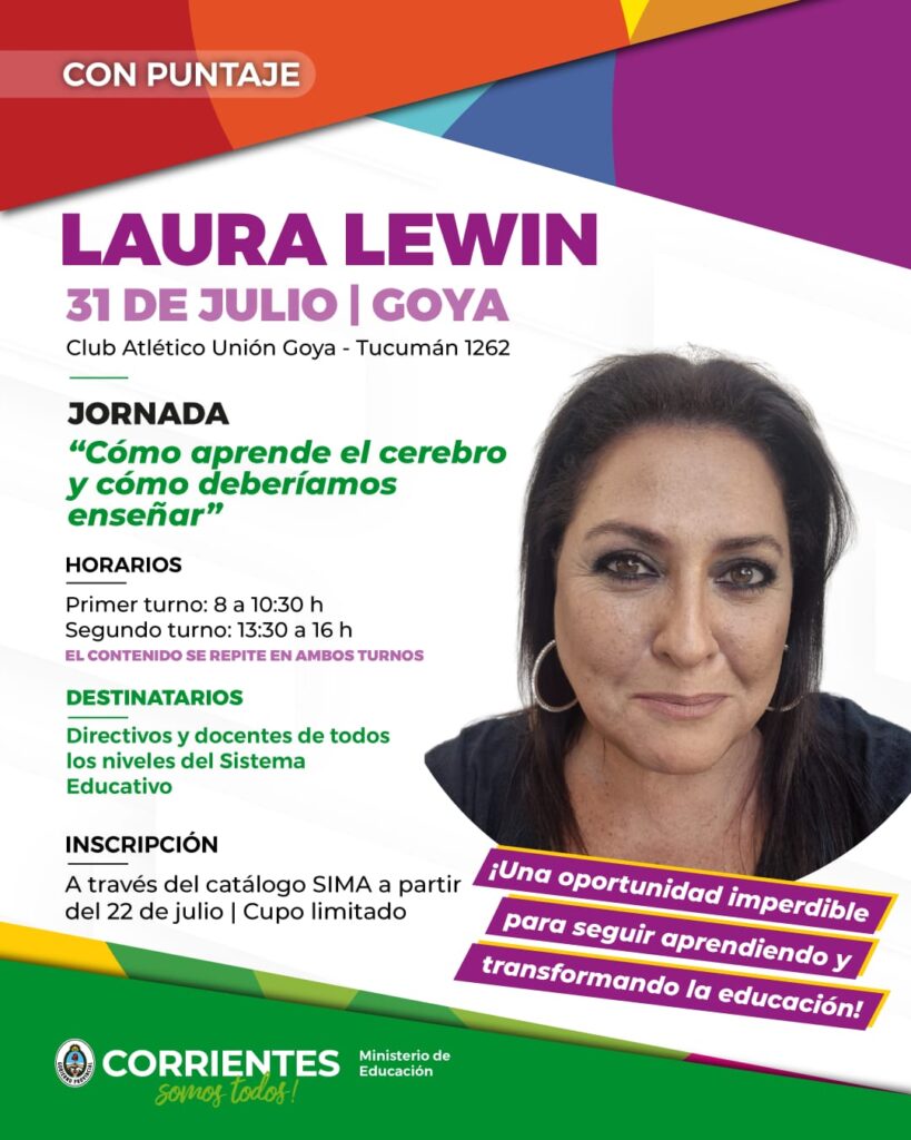 El jueves en doble turno en la sede del Club Unión Laura Lewin dictará un taller de capacitación destinado a directivos y docentes de todos los niveles, el cual otorga puntaje a los docentes que participen del mismo