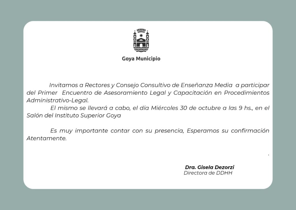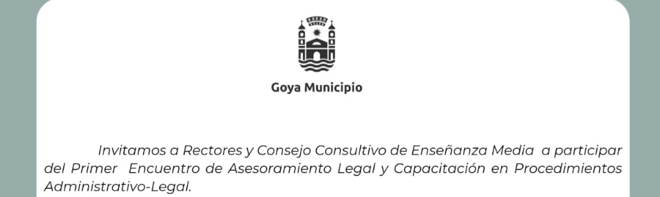 La Dirección de Derechos Humanos de la Municipalidad de Goya, a cargo de la doctora Gisela Dezorzi, invita a los rectores y al Consejo Consultivo de Enseñanza Media a participar del primer Encuentro de Asesoramiento Legal y Capacitación en Procedimientos Administrativo-Legal. Esta jornada busca brindar herramientas y conocimientos fundamentales en materia legal y administrativa para fortalecer las prácticas y procedimientos dentro de las instituciones educativas.