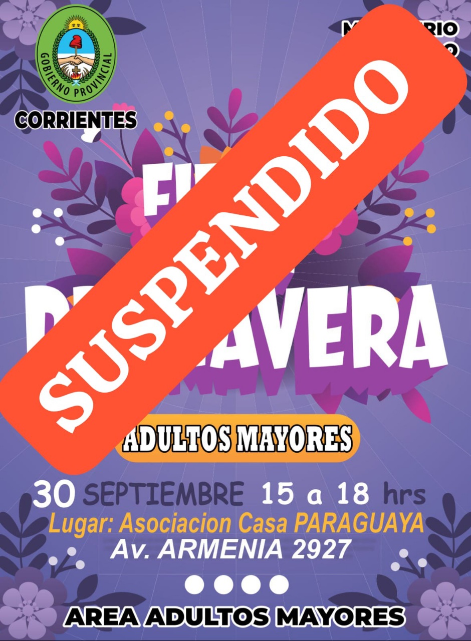 Debido a las inclemencias climáticas, quedó suspendida la Fiesta de la Primavera que debía realizarse hoy, martes 30 de septiembre.