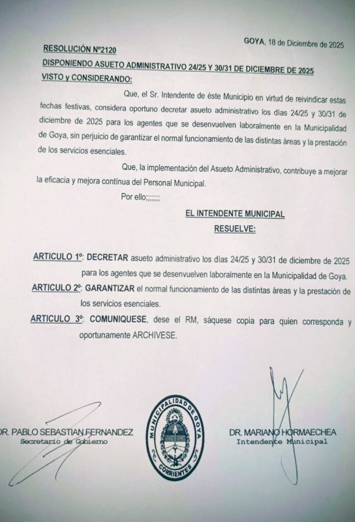 ARTICULO 1º: DECRETAR asueto administrativo los días 24/25 y 30/31 de diciembre de 2025 para los agentes que se desenvuelven laboralmente en la Municipalidad de Goya.