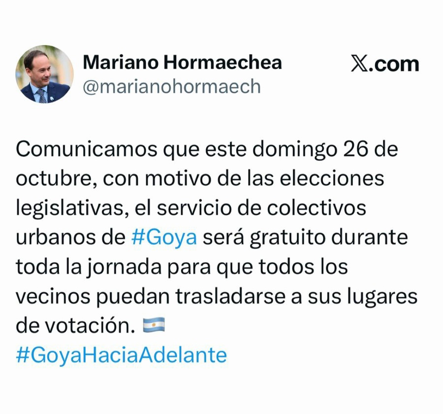 “Comunicamos que este domingo 26 de octubre, con motivo de las elecciones legislativas, el servicio de colectivos urbanos de Goya será gratuito durante toda la jornada para que todos los vecinos puedan trasladarse a sus lugares de votación y poder emitir su sufragio”, expresó el jefe comunal de nuestra ciudad.