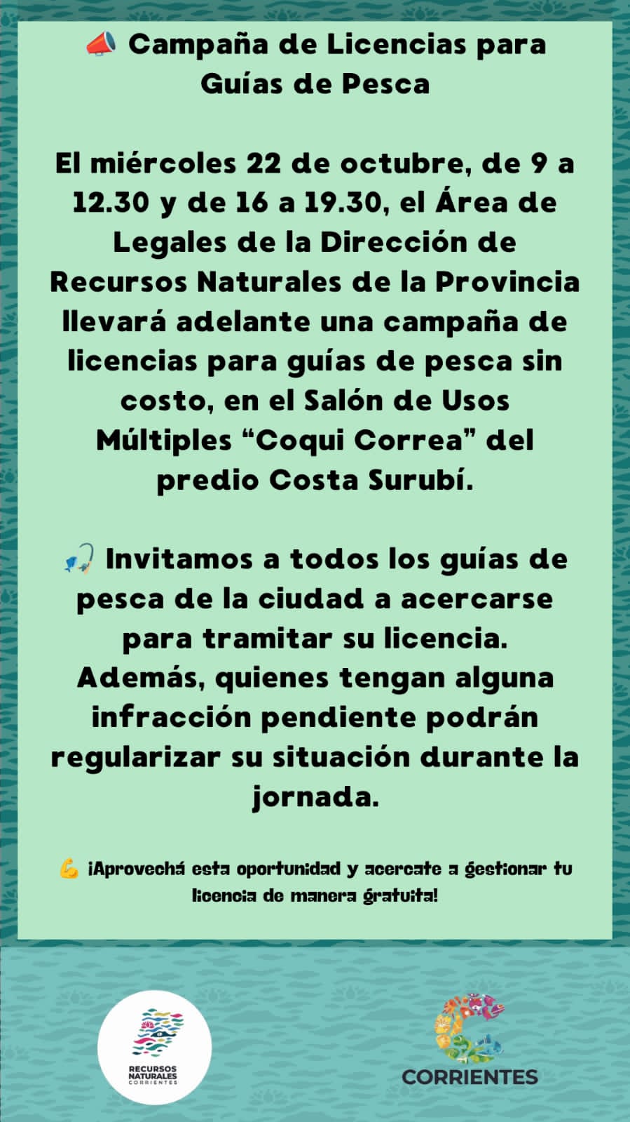 Además de la gestión de licencias de pesca, se atenderán consultas sobre cotos de caza, permisos de campo y normativas vigentes. “La intención es otorgar el carnet de guía de forma gratuita, siempre y cuando no tengan multas, si las tienen, buscaremos solucionarles de la mejor manera posible, ofreciendo descuentos para facilitar su actividad”, explicó Portela.