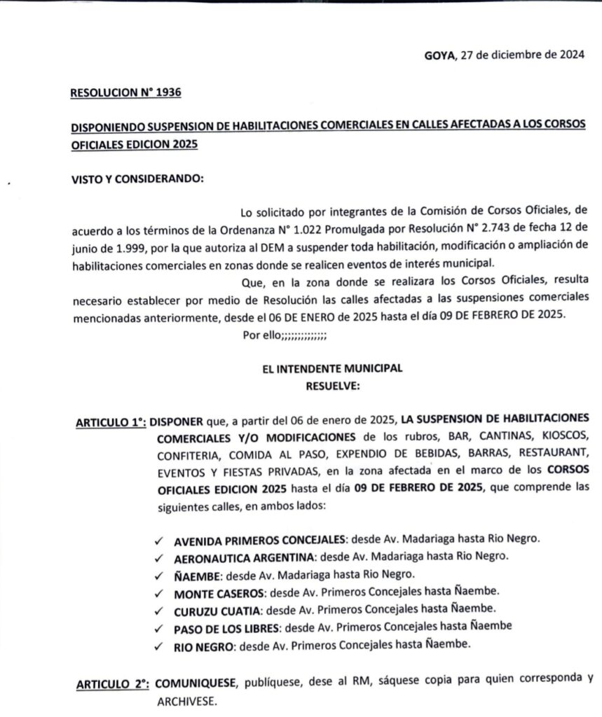 La Municipalidad de Goya dispuso, mediante la Resolución N° 1936, la suspensión de nuevas habilitaciones y modificaciones comerciales en las zonas donde se desarrollarán los Corsos Oficiales, del 6 de enero al 9 de febrero de 2025. La medida alcanza a rubros como bares, kioscos, restaurantes y expendio de bebidas, en calles clave de la ciudad.
