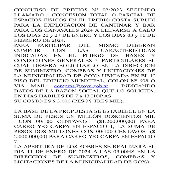 LA APERTURA DE LOS SOBRES SE REALIZARA EL DIA 11 DE ENERO DE 2024 A LAS 09.00HS EN LA DIRECCION DE SUMINISTROS, COMPRAS Y LICITACIONES DE LA MUNICIPALIDAD DE GOYA