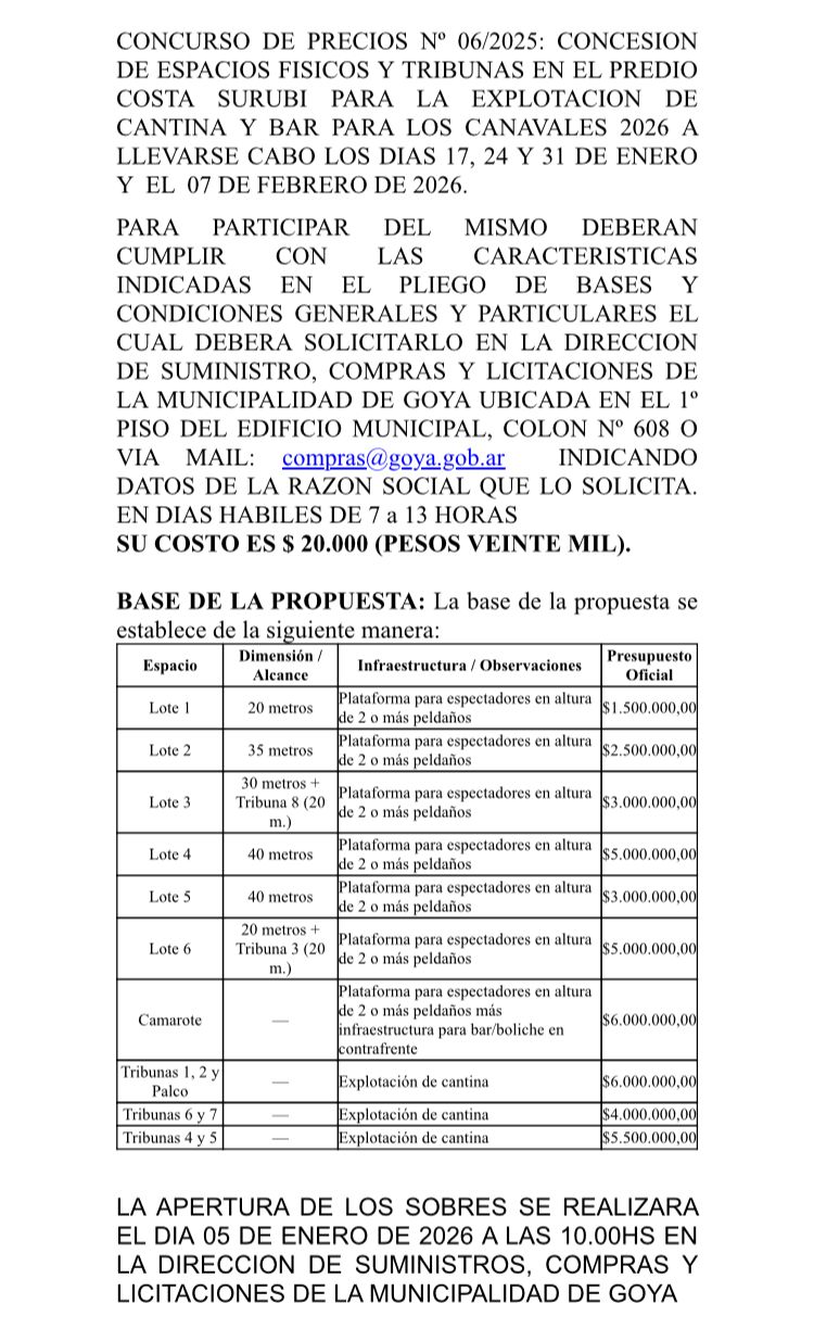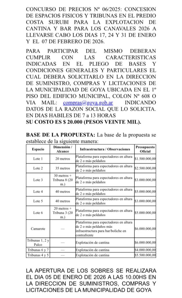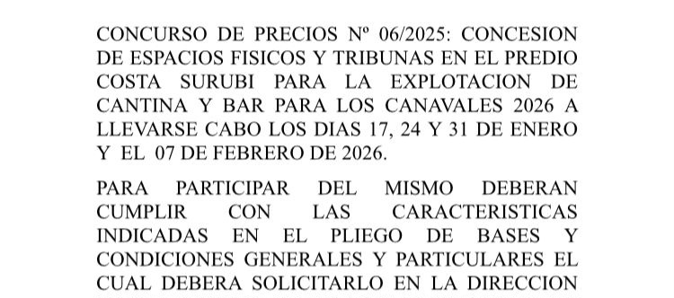 CONCURSO DE PRECIOS Nº 06/2025: CONCESIÓN DE ESPACIOS FÍSICOS Y TRIBUNAS EN EL PREDIO COSTA SURUBÍ PARA LA EXPLOTACIÓN DE CANTINA Y BAR PARA LOS CARNAVALES 2026 A LLEVARSE CABO LOS DÍAS 17, 24 Y 31 DE ENERO Y EL 07 DE FEBRERO DE 2026.