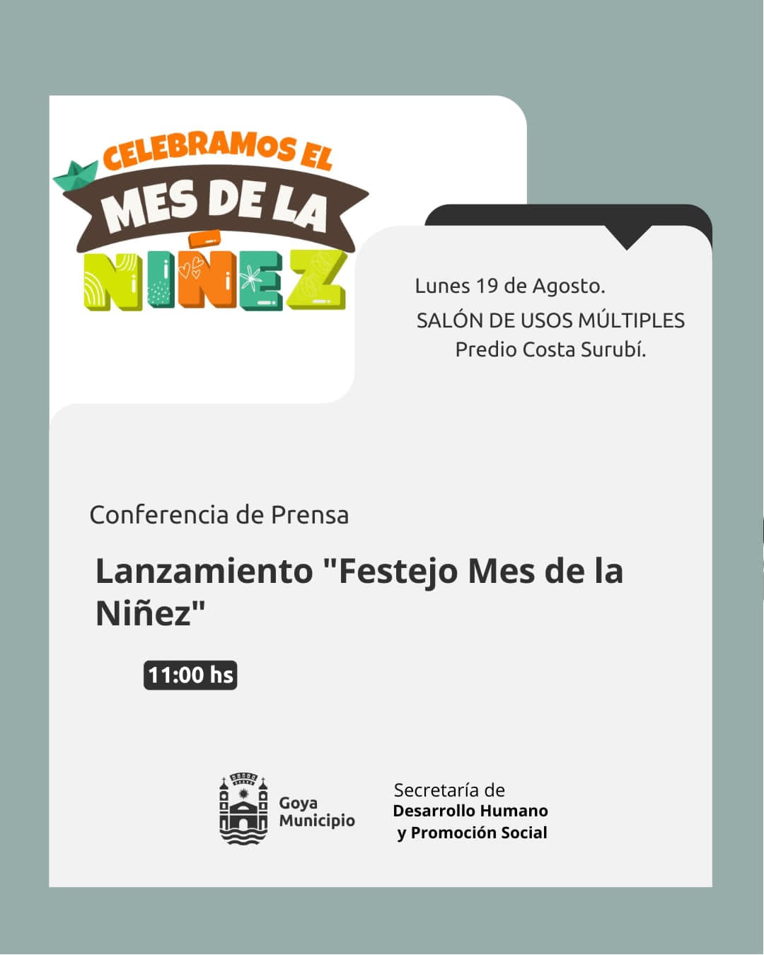 Lunes 19 11 horas en el Salón de Usos Múltiples de Costa Surubí, presentación de la celebración de la Niñez, se espera contar con la presencia de los periodistas, para la correspondiente cobertura.