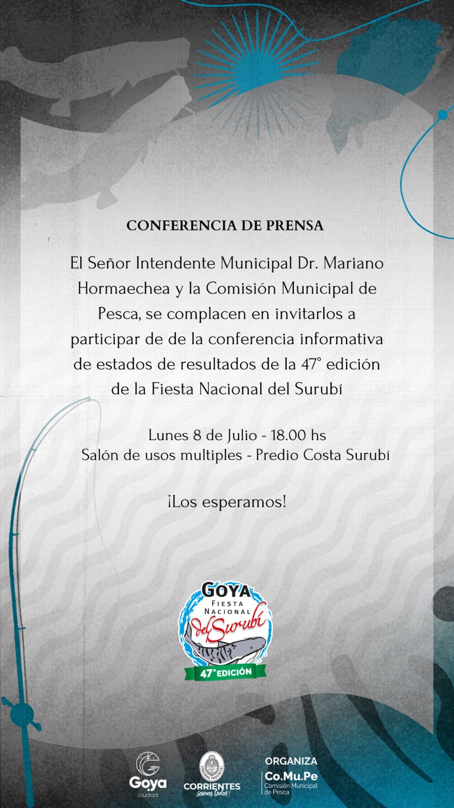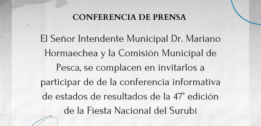 El Intendente Municipal Mariano Hormaechea y la Comisión Municipal de Pesca, invitan a los periodistas a participar de la Conferencia Informativa a brindarse este lunes 8 de julio a las 18 horas, en el Salón de Usos Múltiples, en el Predio Costa Surubí, donde se dará a conocer el estado de resultados de la 47º Edicion de la Fiesta Nacional del Surubí.