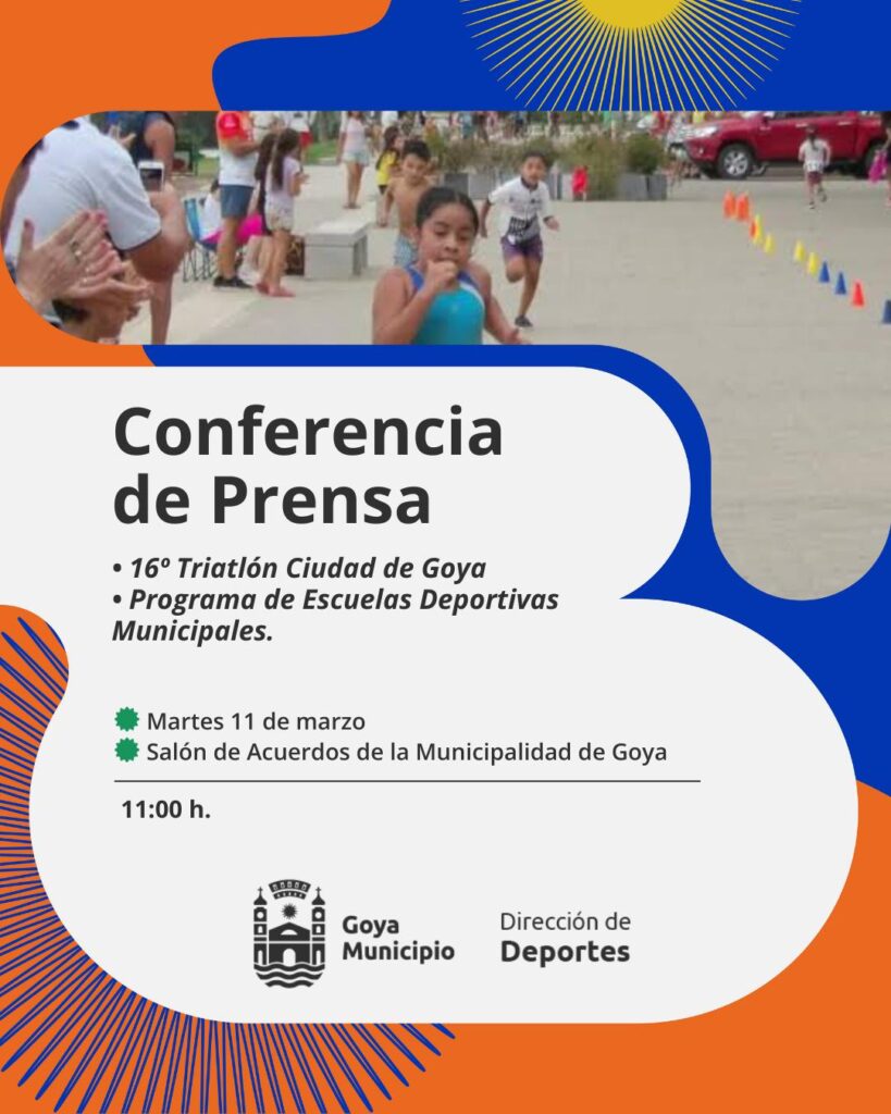 La Dirección de Deportes del municipio invita a la presentación del Programa de Escuelas Deportivas Municipales y próximo 16° Triatlón Ciudad de Goya. Será este martes 11 a las 11:00 horas, en el Salón de Acuerdos de la Municipalidad.
