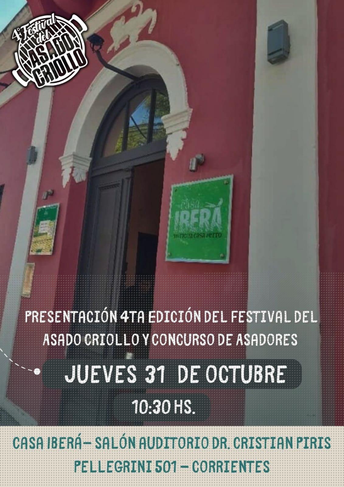 Tradición, música y gastronomía confluirán en Goya este 8 y 9 de noviembre durante la 4ª edición del Festival del Asado Criollo. El anuncio provincial vendrá el jueves 31 de octubre a las 10:30 de la mañana en Casa Iberá de la ciudad de Corrientes.