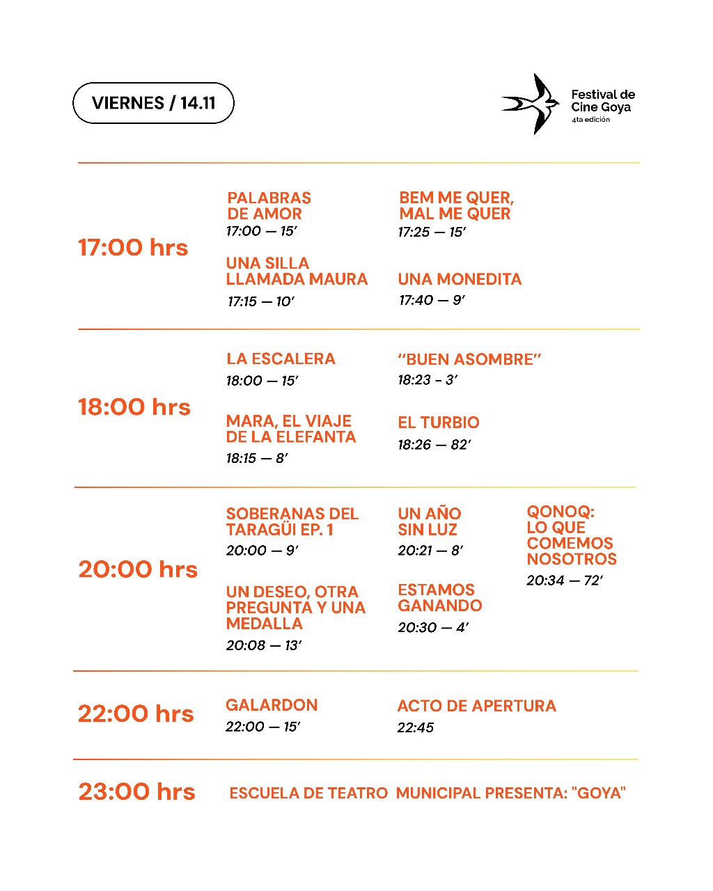 El Teatro Municipal será el escenario durante los días viernes 14, sábado 15 y domingo 16 de noviembre de las proyecciones de cortometrajes, largometrajes y documentales que forman parte de la competencia del Festival de Cine Goya. El otrora Cine Solari servirá de ámbito para que los cinéfilos tengan esta cita con las películas de realizadores del país y del extranjero en la 4ª temporada de este evento.