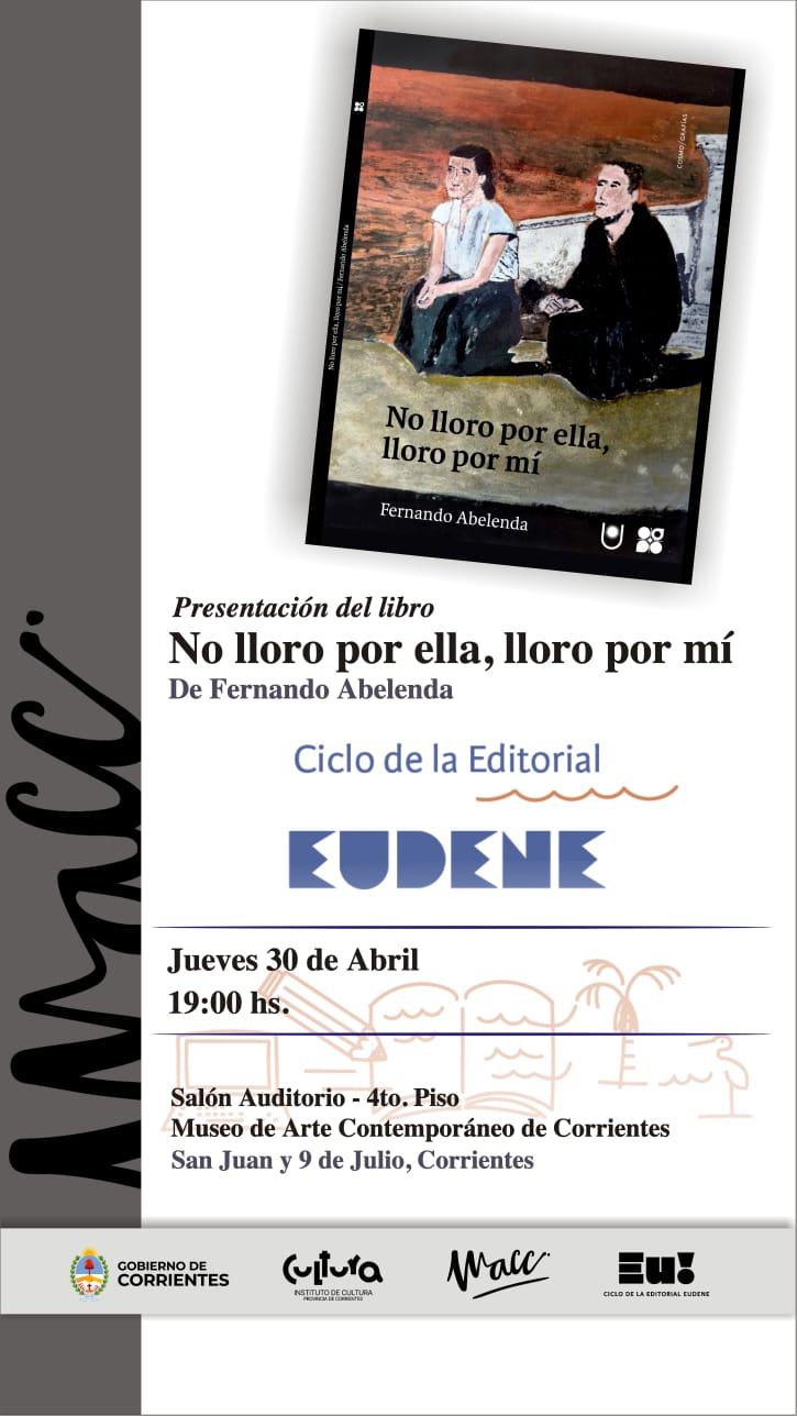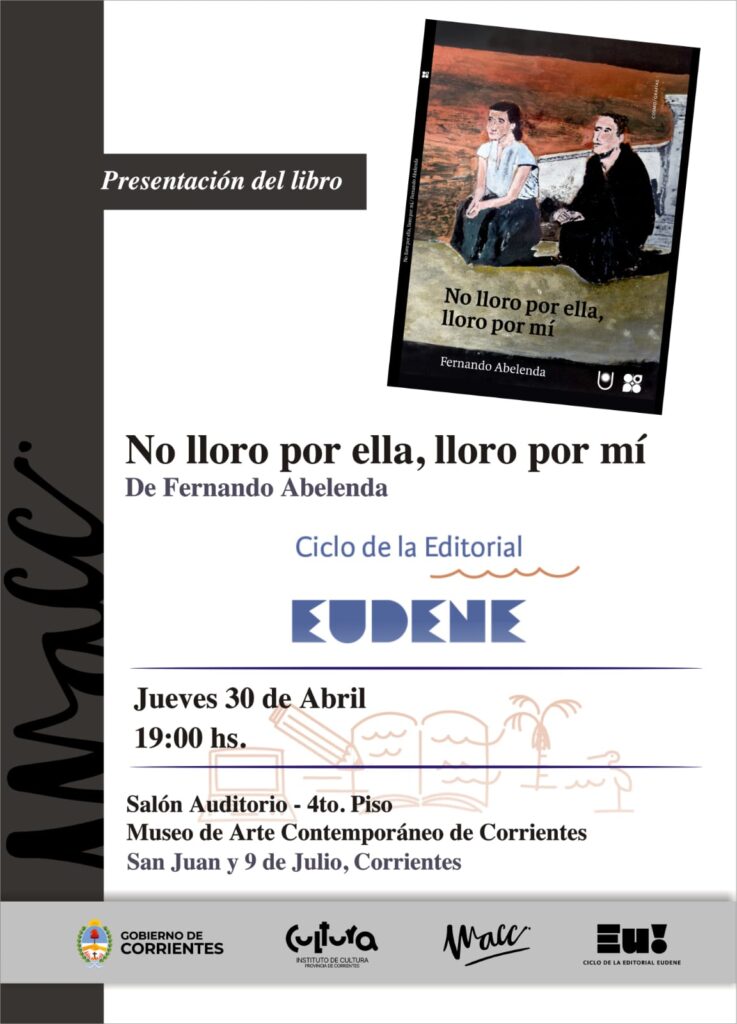El jueves 30 de abril, a las 19, el Salón Auditorio del Museo de Arte Contemporáneo de Corrientes (4º piso) será escenario de la presentación del libro “No lloro por ella, lloro por mí”, de Fernando Abelenda. La actividad marcará el inicio del ciclo EU!, una nueva propuesta impulsada por el Instituto de Cultura de Corrientes junto a la editorial de la Universidad Nacional del Nordeste (EUDENE).