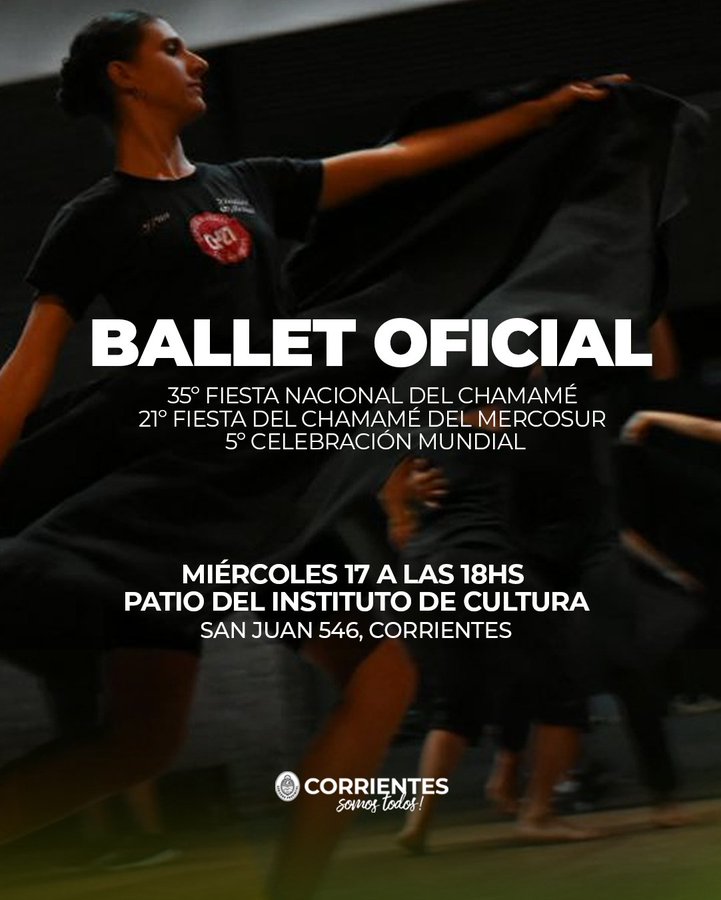 El Gobierno de Corrientes, a través Instituto de Cultura, en el marco del camino hacia la 35ª Fiesta Nacional del Chamamé, 21ª Fiesta del Chamamé del MERCOSUR y 5ª Celebración Mundial, convoca a bailarines a participar de la audición para conformar el Ballet Oficial del máximo evento chamamecero, bajo la dirección del maestro Luis Marinoni. La audición se realizará el miércoles 17 de diciembre, a partir de las 18, en el patio del Instituto de Cultura, ubicado en San Juan 546, de Capital.