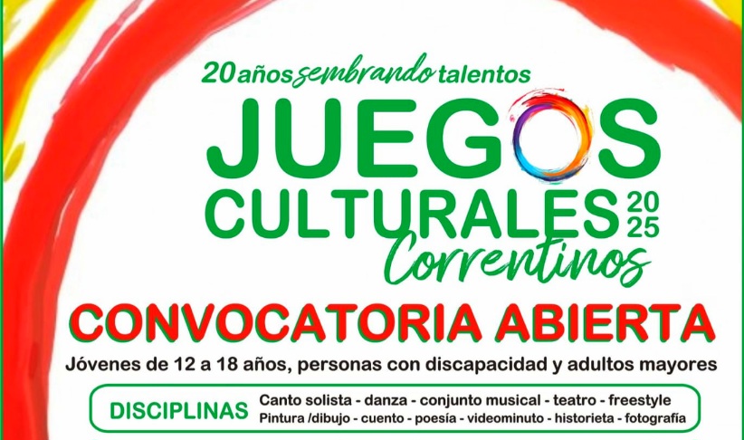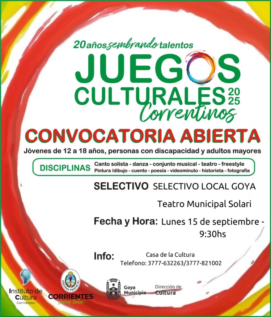 El Gobierno de la Provincia de Corrientes, a través del Instituto de Cultura y la Municipalidad de Goya, a través de la Dirección de Cultura convocan a jóvenes de 12 a 18 años, personas con discapacidad y adultos mayores a participar de los Juegos Culturales Correntinos. Las definiciones de esta instancia se llevarán a cabo en el Teatro Municipal Solari, el lunes 15 de septiembre desde las 9:30 horas.