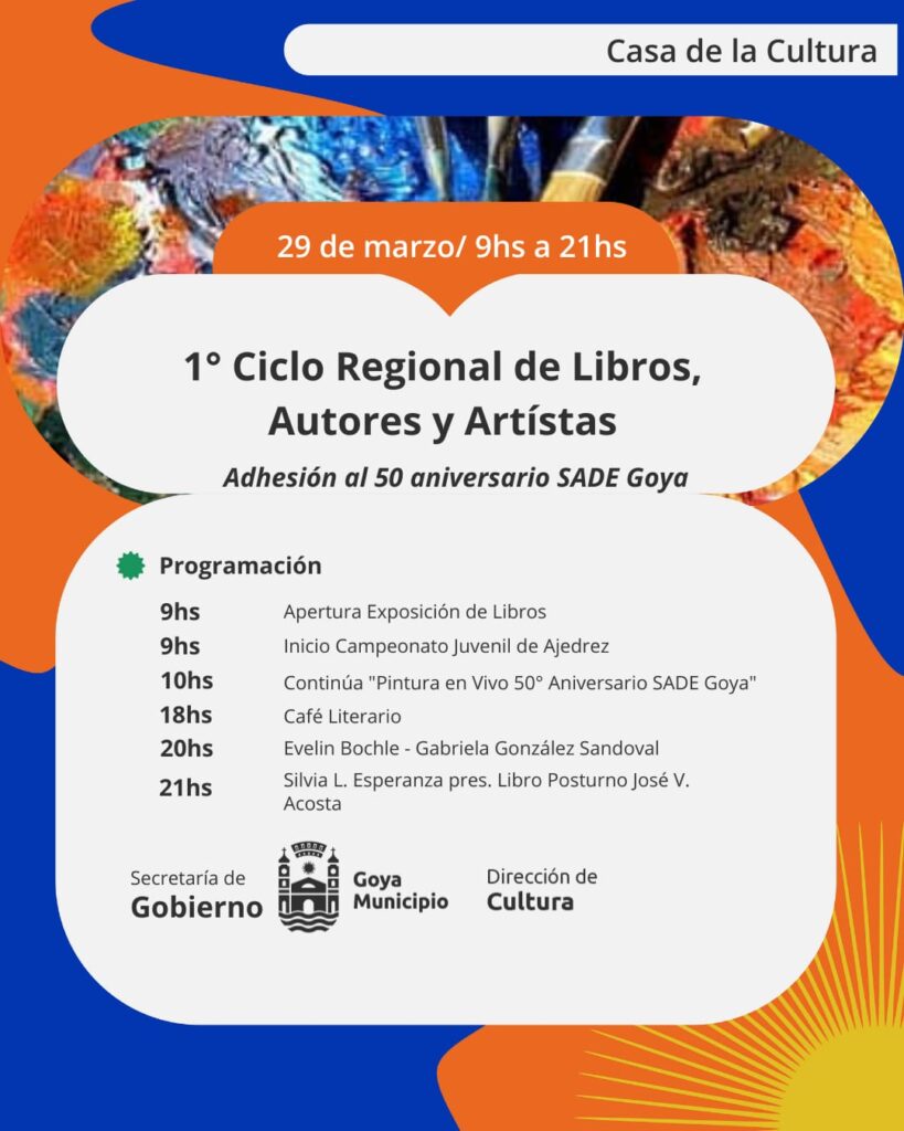 Este sábado concluye el 1° Ciclo Regional de Libros, Autores y Artistas, en adhesión al 50 aniversario de la Sociedad Argentina de Escritores Filial Goya, con una programación renovada casi en su totalidad y la presencia de distintas editoriales que ofrecen títulos de interés.