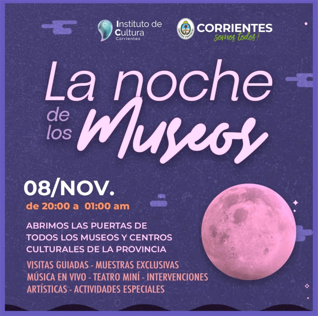 La presidenta del Instituto de Cultura, Beatriz Kunin, brindará detalles de la iniciativa, prevista para el sábado 8 de noviembre en el horario de 20 a 1 de la madrugada, con distintas muestras, espectáculos y actividades especiales en museos y espacios culturales. Es así que «una noche especial dará inicio con la inauguración del Museo de Arte Contemporáneo de Corrientes, en San Juan 839, que se llevará a cabo a las 20 horas, con la presencia de autoridades provinciales e invitados especiales», informaron.