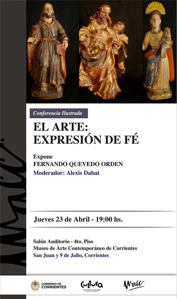 El Instituto de Cultura de Corrientes invita a participar de la conferencia ilustrada “El arte: expresión de fe”, que se realizará el jueves 23 de abril a las 19 en el Salón Auditorio del Museo de Arte Contemporáneo de Corrientes (MACC), ubicado en la intersección de San Juan y 9 de Julio. La actividad es libre y gratuita. La disertación estará a cargo de Fernando Quevedo Orden, con la moderación de Alexis Dabat.