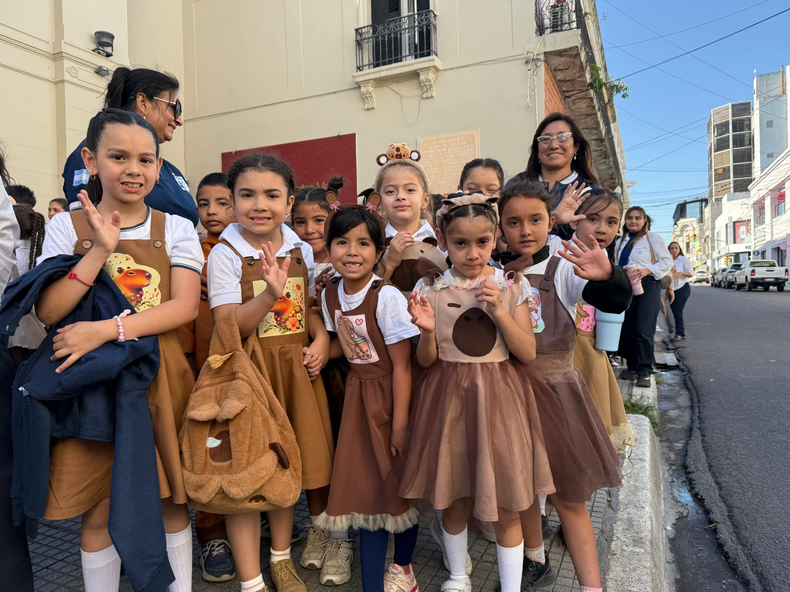 Dos actores caracterizados como Guacamayos rojos gigantes se instalaron a las 9.30 de la mañana de este jueves para recibir a los más de 400 chicos de la escuela Nº1 Manuel Belgrano, más de 100 de la escuela Nº 10 y cerca de 80 de la escuela Normal “Juan Pujol”, quienes fueron especialmente invitados por el Ministerio de Educación para disfrutar de la puesta en escena del musical “Epopeya del Iberá”; en el segundo de tres días de funciones.