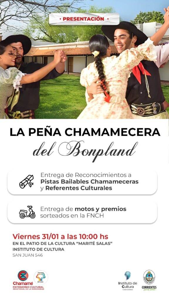 Este viernes 31 de enero, a las 10, en el Patio de la Cultura Marite Salas del Instituto de Cultura (San Juan 546) se realizará el acto de entrega de los premios sorteados durante la 34ª Fiesta Nacional del Chamamé, y se reconocerá a distintas pistas bailables y parejas de baile. Se anunciará además la peña chamamecera a desarrollarse durante febrero en el Museo de Ciencias Naturales Amado Bonpland.