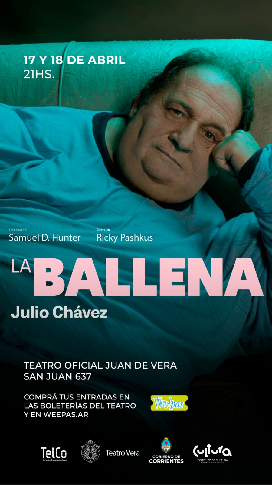 Se presentará este fin de semana, 17 y 18 de abril a las 21, en el Teatro Oficial Juan de Vera. La obra de teatro es protagonizada por el reconocido actor Julio Chávez, bajo la dirección de Ricky Pashkus. La misma es reconocida mundialmente e inspiró la película por la que Brendan Fraser ganó un Oscar.