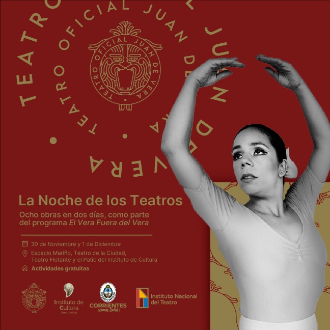 El Teatro Oficial Juan de Vera, dependiente del Instituto de Cultura de Corrientes, anuncia el desarrollo de “La Noche de los Teatros” los días sábado 30 de noviembre y domingo 1 de diciembre, en el marco del programa “El Vera fuera del Vera”, actividad coproducida junto a la representación Corrientes del Instituto Nacional del Teatro y la Asociación Civil de Trabajadores Escénicos de Corrientes.