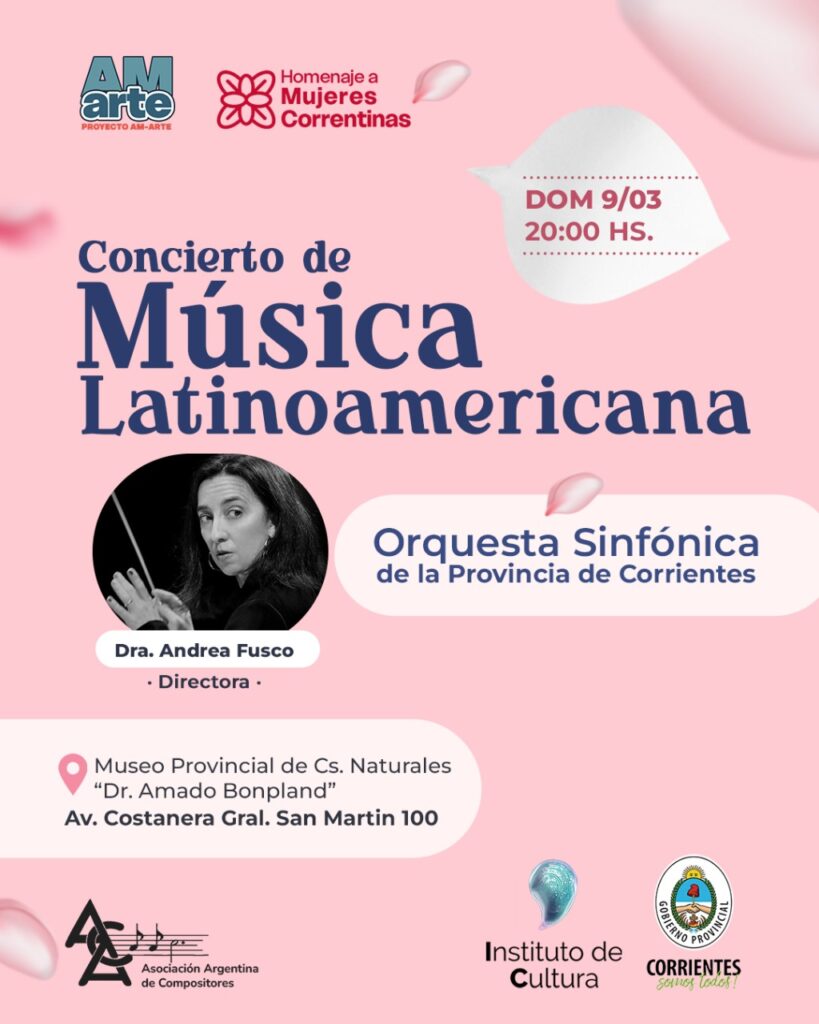 Organizado por el Gobierno de Corrientes, a través del Instituto de Cultura, la Orquesta Sinfónica de la Provincia brindará un concierto gratuito en el marco del Día Internacional de la Mujer. El mismo tendrá lugar el domingo 9 de marzo, a las 20, en el Museo de Ciencias Naturales Amado Bonpland (Av. Costanera General San Martín 100). En el caso de lluvia, se reprogramará para el domingo 16.