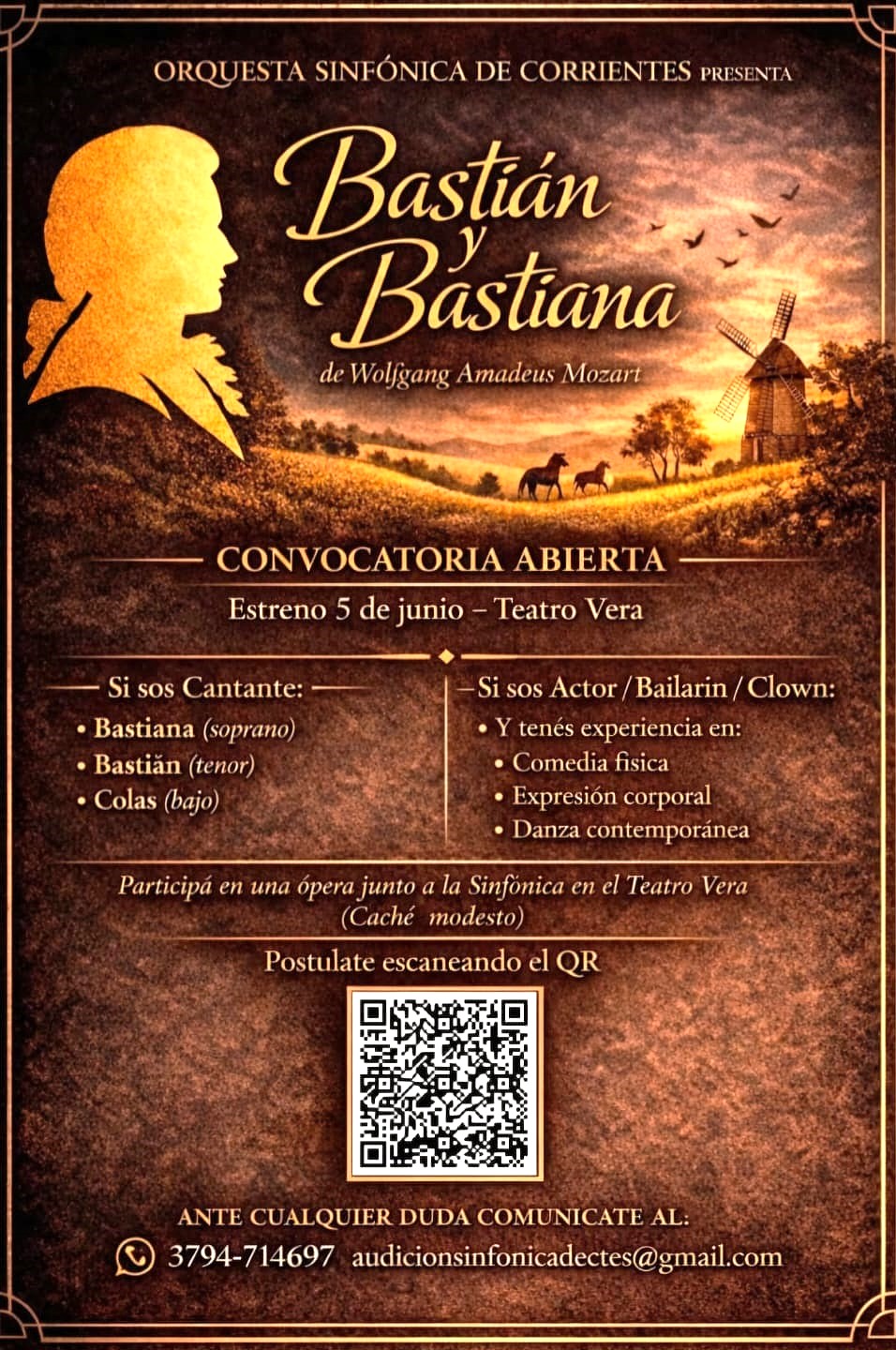 El Instituto de Cultura de Corrientes, a través de la Orquesta Sinfónica de Corrientes, lanza una convocatoria abierta a cantantes, actores y bailarines para participar en la producción de la ópera Bastián y Bastiana, una de las primeras composiciones escénicas del reconocido músico austríaco Wolfgang Amadeus Mozart.