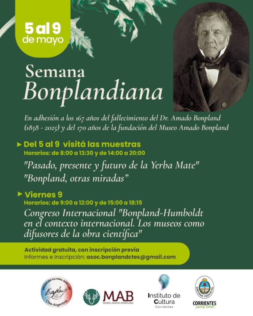 Esta actividad se llevará adelante en el marco de los 167 años del fallecimiento de Bonpland, y 170 años de la fundación del Museo de Ciencias Naturales que lleva su nombre, con el acompañamiento de la Asociación Civil Cultural Bonpland y ADiMRA (Asociación de Directores de Museos de la República Argentina).